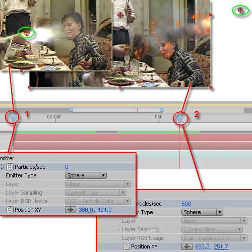 Как и раньше, перетащите левый край нового слоя вровень с уже существующим эффектом. Установите на этом кадре ползунок, и проделайте те же операции по установке первой и последней ключевых точек. Создав траекторию движения частиц, не забудьте поработать над их количеством: в первом кадре впечатайте 0, а, отступя два-три кадра, установите значение 400, а то и все 500. Теперь сцена еще более оживилась за счет золотистых искр, которые, вылетев вместе с огнем и дымом, медленно тают и растворяются в воздухе. На рисунке ниже зеленым овалом обведено положение эмиттера частиц в начале сцены и ее конце. Здесь приведены настройки эффекта, относящиеся к данным конкретным кадрам.