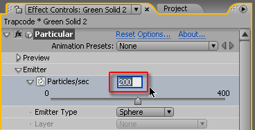 Перейдите на пару кадров вперед, и, не трогая часики, снова впечатайте значение 200. Теперь плотность эмиттера вырастает с нуля до двухсот частиц в течение двух кадров. Нажмите в цифровой части клавиатуры 0, и подождите, пока программа просчитает эффект. Получилось натурально.