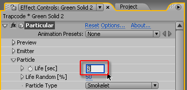Нажмите 0 и просмотрите, что у вас получилось. Если по каким-либо причинам результат не устраивает, то, скорее всего, этими причинами являются слишком быстрое исчезновение дыма и тот факт, что дым этот не поднимается кверху, как ему полагается. Сейчас исправим. Снова зайдите в настройки эффекта, откройте вкладку Particle, и установите в строке Life [sec] значение 3. Тем самым вы продлите время жизни частиц с одной до трех секунд.