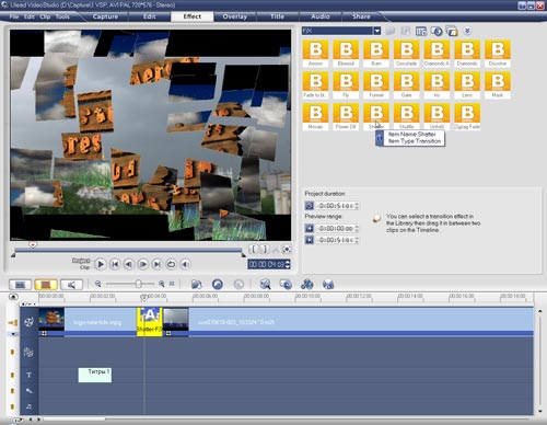 Привычного титровальщика в виде отдельного модуля в этой программе нет. Да и зачем он нужен, когда текст печатается прямо на экране, шаблон титров выбирается в копилке проекта, а параметры текста и шаблона правятся тут же, на панели инструментов?