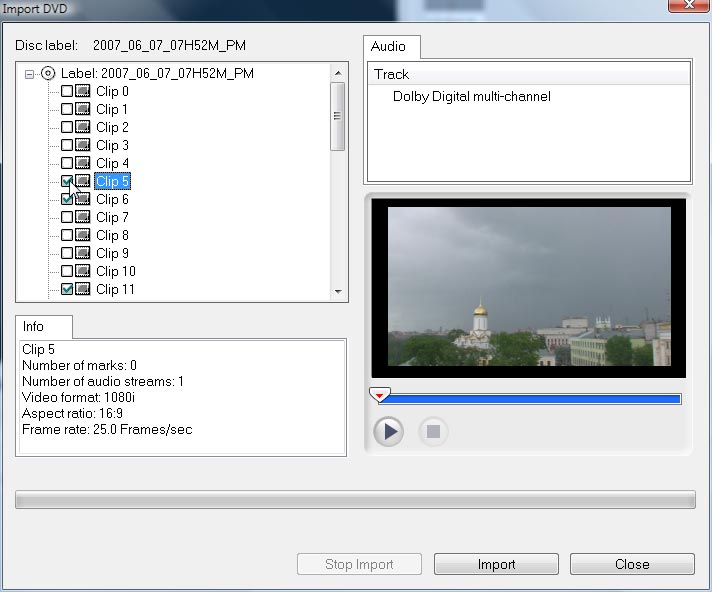 Программа без труда распознала все имеющиеся на диске клипы, и предложила выбрать любой из них для импорта в проект. Что и было сделано.