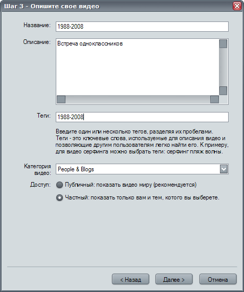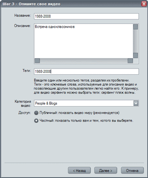 Предпоследний шаг — заполнение формы сведений о выгружаемом фильме. Здесь необходимо заполнить все поля, иначе выгрузка видео не состоится (впоследствии эти сведения можно отредактировать непосредственно на страничке с фильмом).