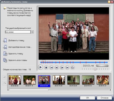В открывшемся окне вы уже видите разбитое на сцены содержимое своего будущего диска. Кроме того, что сцены расположены на таймлинии в виде отдельных клипов, места начала этих сцен обозначены красными метками на полосе прокрутки под окном просмотра. Здесь пользователь может (пока не поздно) добавить главу или удалить ненужные главы. Не вредно воспользоваться и автоматическим способом назначения глав: как по заданному пользователем временному интервалу, так и по местам смены сцен.