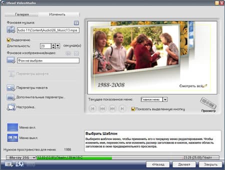 Однако лучше всего не ограничиваться этим выбором, а полностью изменить внешний вид меню, выбрав собственный фон, шрифты и расположение элементов. К счастью, модуль авторинга позволяет все это проделать. Не забыты здесь и эффекты появления/исчезновения меню, появление/затухание фонового звука; помимо прочего, в распоряжении пользователя — 15 вариантов оформления навигационных кнопок.