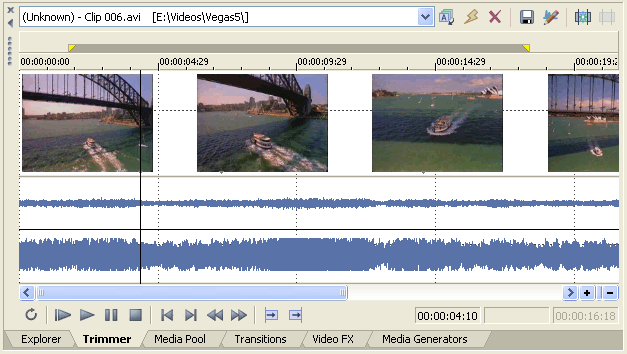 Закончив захват исходного видеоматериала перейдем непосредственно к редактированию видео. С первого взгляда заметна ориентация разработчиков на обеспечение максимального комфорта пользователя - все фильтры и обработки (как видео так и звуковые) работают в режиме Real Time Preview — т. е. результат изменения установок можно проконтролировать непосредственно в момент редактирования, без дополнительного предварительного просчета (хотя кого сейчас этим удивишь). Другой особенностью является группирование наиболее часто применяемых инструментов в одном окне (в левом нижнем углу экрана). Работа с ними довольно удобна — в любой момент можно просто выбрать соответствующую закладку и задействовать необходимую функцию. Здесь находятся Explorer (операции с файлами), Trimmer (прецизионная коррекция стыков), Media Pool (коллекция используемых в проекте клипов), Transitions/ Video FX (набор различных переходов и видеоэффектов, соответственно) и Media Generators (библиотека шаблонов титров, тестовых таблиц, статичных изображений и динамичных фонов).