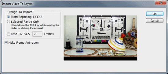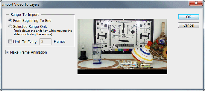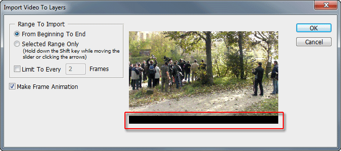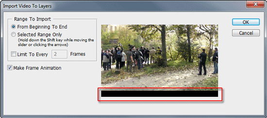 В открывшемся окне выбора файла следует найти нужное видео, и нажать Load. Тут же появится окно с параметрами импорта Import Video to Layers . Обратите внимание: на рисунке красной рамкой обведена чёрная прямоугольная область. Здесь спрятана шкала времени с ползунком, передвигая который, можно просмотреть импортируемое видео и даже выбрать интервал, который нужно импортировать. По непонятной причине у автора эта шкала не отображается (возможно, виновата Windows 7), хотя видео можно проиграть, передвигая этот невидимый ползунок вслепую.