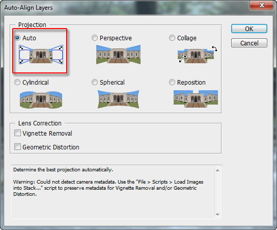 Теперь необходимо выделить все эти слои (Alt+Ctrl+A), и выполнить команду Edit -> Auto-Align Layers. Данная команда запускает встроенный в Photoshop модуль, выравнивающий слои (Align (англ.) — выравнивание). В открывшемся окне желательно выбрать параметр Auto и нажать ОК.