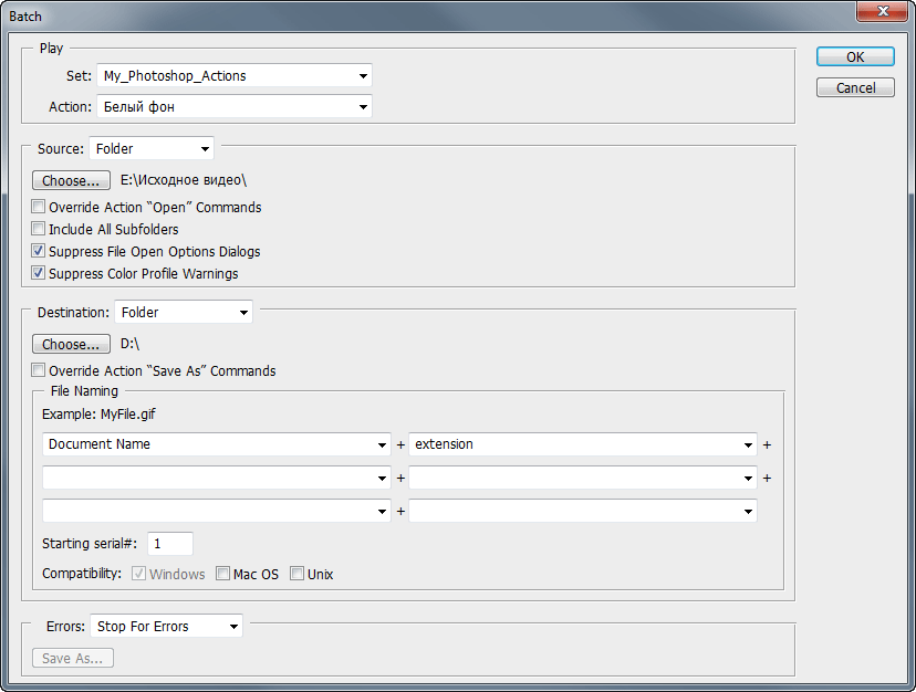 Итак, File -> Automate -> Batch... В появившемся окне нужно выбрать только что созданную Action, указать папку, где находятся видеофайлы, требующие обработки, и папку, куда станет сохраняться обработанное видео.