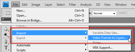Рассмотрим оба варианта, и выясним их преимущества и недостатки. Итак, первый вариант, импорт видео с разделением на отдельные кадры: File -> Import -> Video Frames to Layers...