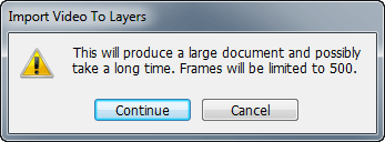 Время, необходимое программе для разбиения материала на кадры (слои), зависит от длительности клипа, а также способа сжатия видео (на современном достаточно мощном ПК импорт 5-секундного AVCHD клипа производится за 20-30 секунд).