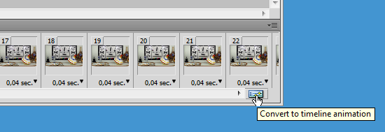 Следующий шаг — изменение режима отображения материала на панели Animation из режима отдельных сцен (кадров) в режим слоёв. Нажмите кнопку Convert to timeline animation, находящуюся в правом нижнем углу палитры Animation.