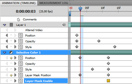 Всё как обычно: щёлкаем по пиктограмме с будильником, тем самым активируя запись параметров в ключевые точки. Изменяем значение выбранного параметра (к примеру, прозрачность слоя) — тут же в соответствующей строке автоматически появится новая ключевая точка. Теперь, проигрывая таймлинию, можно наблюдать, как постепенно изменяются отредактированные параметры.