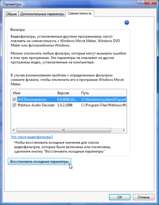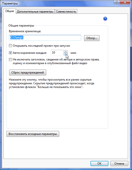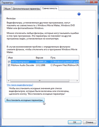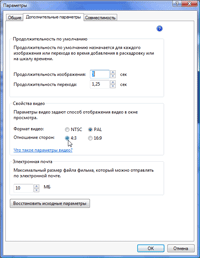 На первой вкладке одним из важных пунктов можно считать интервал времени, через который программа производит автоматическое сохранение проекта; на второй вкладке пользователь может изменить длительность показа фотографий при размещении их на таймлинии программы, а также длительность анимированного перехода между ними. Здесь же выбирается соотношение сторон и телевизионный формат видео. Последняя вкладка содержит список доступных программе кодеков, установленных в операционной системе. Что интересно — любой из них можно отключить, сделав недоступным для MovieMaker.