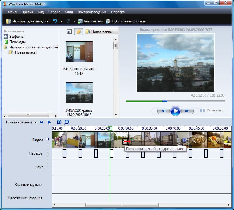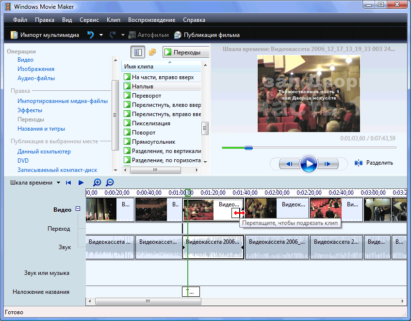 По окончании захвата полученный клип автоматически будет импортирован в MovieMaker, однако, с некоторыми особенностями. Несмотря на то, что программа создала один-единственный AVI-файл в указанной пользователем папке, этот же файл, импортированный в программу, выглядит разбитым на сцены. Разбитым не просто по времени включения-выключения камеры (таймкоду), но вдобавок и по оптическому признаку (смене картинки).