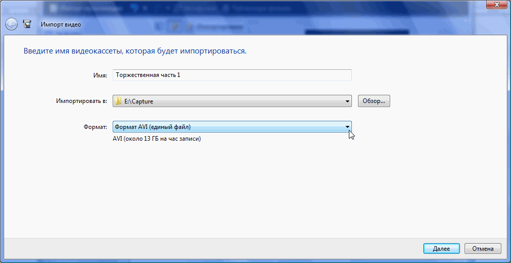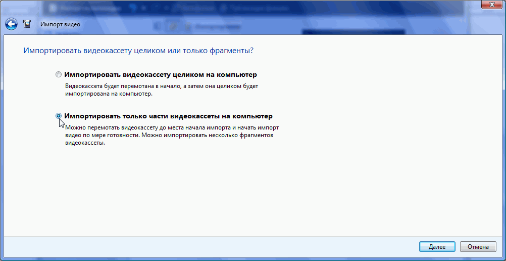 Следующее гигантских размеров окно содержит лишь два пункта, выбор которых зависит от пожеланий пользователя: совсем не обязательно сливать на жесткий диск целую кассету, если нужно захватить лишь короткий минутный эпизод.