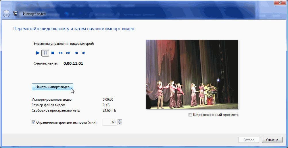 Наконец, открылось окно, где и будет происходить захват. Управление камкордером здесь осуществляется стандартными кнопками, существует также настраиваемое ограничение времени захвата. Если пользователь выбрал в предыдущем окне первый пункт, то можно смело нажимать кнопку Начать импорт видео, и найти более важные дела на ближайшие час-полтора, пока проигрывается и захватывается кассета.