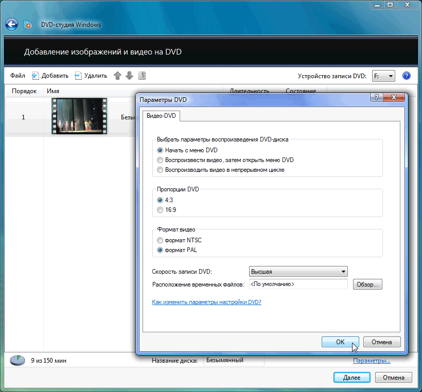 Все предельно просто: в поле «Выбрать параметры воспроизведения DVD-диска» выбирается схема построения DVD, в разделе «Пропорции DVD» — соотношение сторон видео (аспект), а в третьем — ТВ-стандарт (в России применяется PAL). На параметр «Скорость записи DVD» обращать внимание, по большому счету, не требуется (за исключением случаев, когда просматривать DVD планируется на проигрывателе, не умеющем читать диски, записанные на высоких скоростях). А на пункт «Расположение временных файлов» следует обратить внимание: это поможет немного ускорить создание диска, его просчет. Дело в том, что любая программа, работающая с видео, во время обработки видео постоянно обращается к исходному файлу, одновременно записывая результат в новый файл. И, если диск сильно фрагментирован, или имеет низкую скорость вращения, работа может сильно замедлиться. Чтобы этого избежать, нажмите кнопку «Обзор» и выберите другой жесткий диск, не тот, на котором расположен исходный видеоматериал.