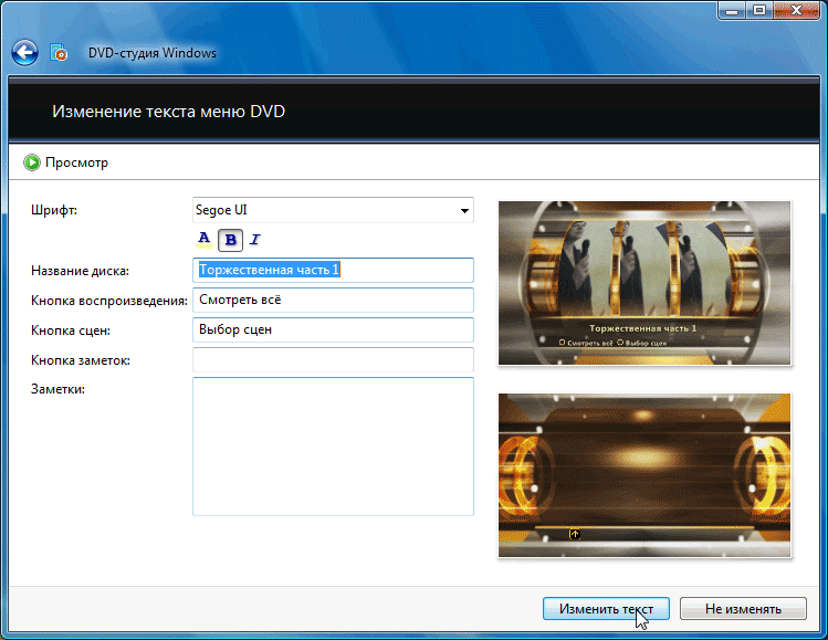Но вернемся к работе. Немаловажная ее часть — это создание своих надписей в меню. Не оставлять же безликие фразы «Безымянный», «Просмотр» или «Сцены»? Впишите в нужные поля свой текст, и выберите устраивающий шрифт.