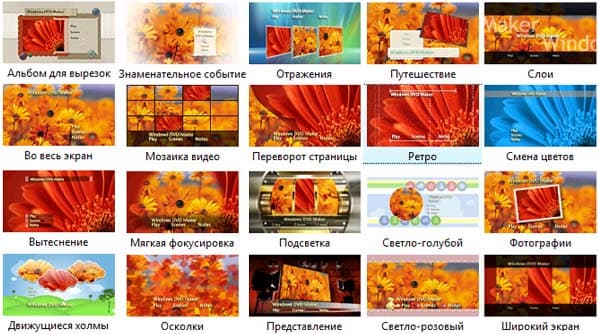 Кроме надписей, изменению поддается также видео, показываемое в меню (по умолчанию программа берет кадры из видео, импортированного в проект), фоновый звук, и стиль оформления кнопок.