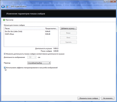 Если пользователь добавил в проект папку с фотографиями, то желательно внести кое-какие изменения и в параметрах показа слайдов. Во-первых, подобрать музыкальное сопровождение, которое будет звучать во время показа фотографий. Когда мелодия подобрана и файл выбран, то лучше всего будет отметить флажком пункт "Изменить длительность показа слайдов соответственно длительности музыки", а не оставлять значение фиксированным. Правда, в этом случае нужно мысленно сопоставить количество импортированных фотографий и длительность выбранной мелодии, и подсчитать среднее время показа отдельной фотографии. Нехорошо получится, если фотографии будут мелькать с бешеной скоростью или, того хуже, подолгу демонстрироваться на экране, вгоняя зрителей в тоску.