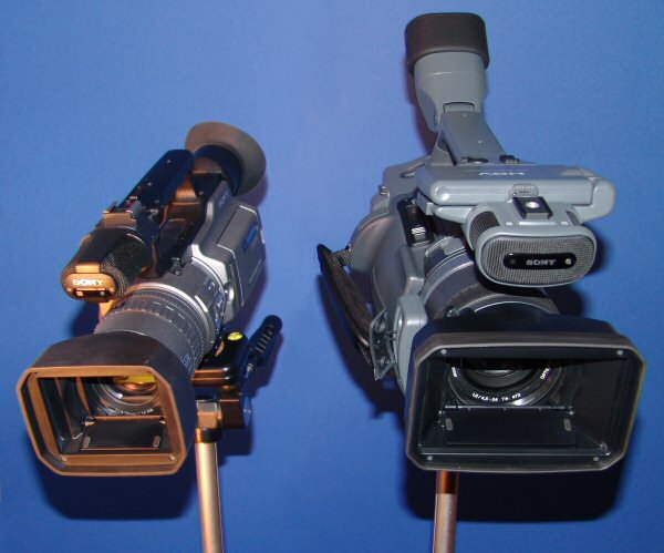 У high definition-модели сразу привлекает внимание большой микрофон, соединенный с корпусом напрямую, без демпфирующей прокладки (очевидно, внутри находятся гасящие вибрацию подвесы) и просто огромное число органов управления. Такого количества ручных настроек не было ни у одной полупрофессиональной модели Sony.