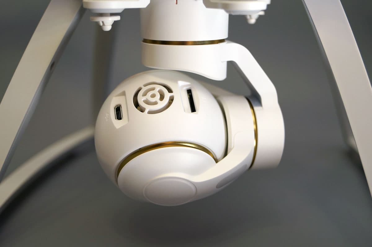 Аппарат нельзя эксплуатировать во время даже слабого дождика. Речь не только о камере, а о коптере в целом. Ничем не защищенные служебные интерфейсы камеры находятся на стороне корпуса, противоположной объективу: здесь размещены порт micro USB и слот для карты памяти формата micro SD/SDHC. Между ними можно видеть решетку, под которой находится миниатюрный вентилятор, охлаждающий электронную начинку камеры. Пусть читателя не беспокоит звук работающего вентилятора: рассматриваемая камера в данной реализации не записывает звук. Вообще. Кстати, очень жаль.