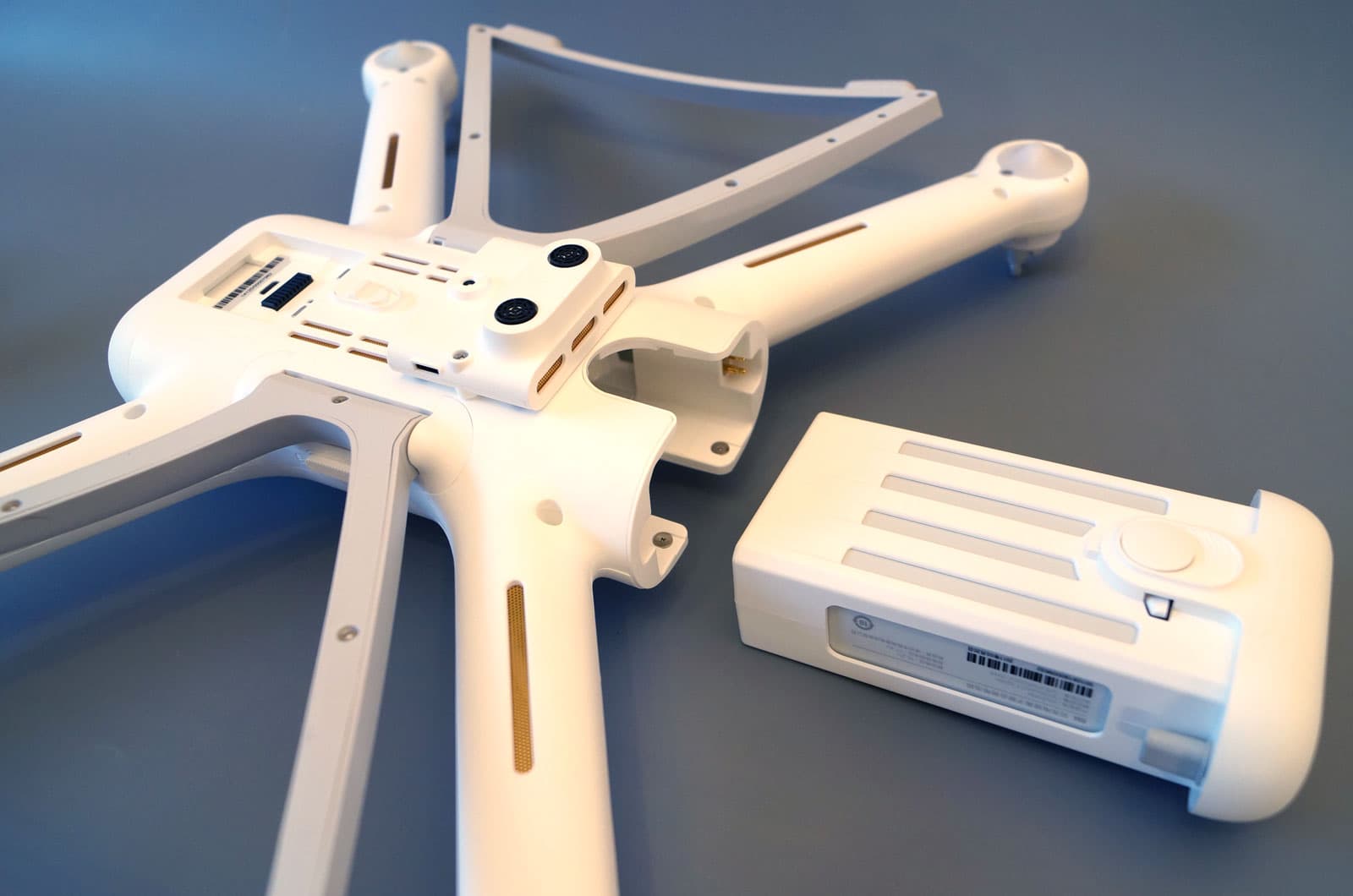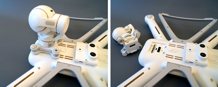 Блок камера/подвес легко отстегивается от корпуса. Настолько легко, что это вызывает серьезные опасения. А вдруг в полете отщелкнется? Скорее, вряд ли. А вот общая хрупкость всей конструкции — это действительно вопрос. Здесь нет ни кусочка металла, все детали изготовлены из разных пластиков. Что двигало разработчиками? Снижение веса? Может быть. Но в любом случае — никак не увеличение надежности и прочности.
