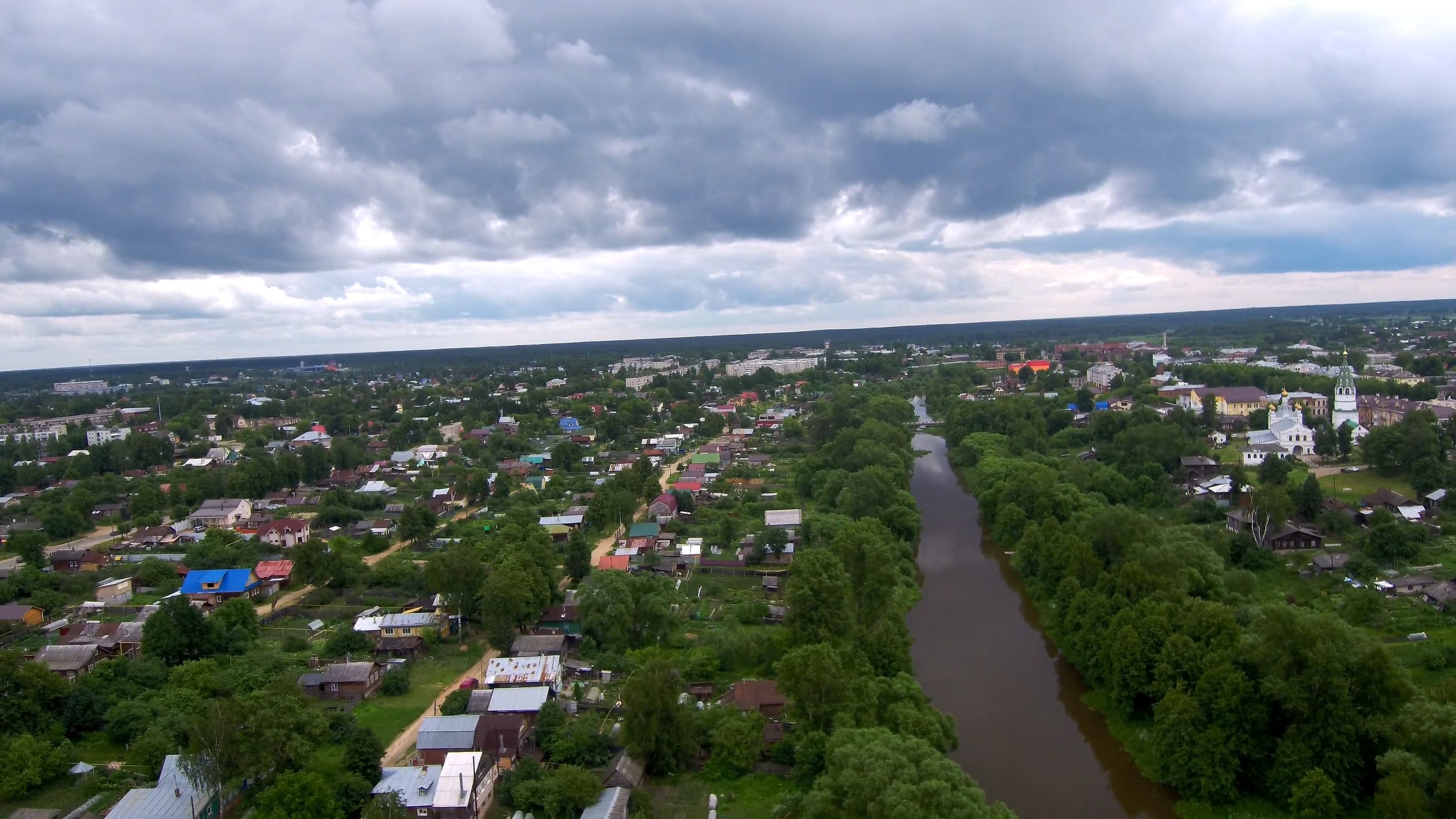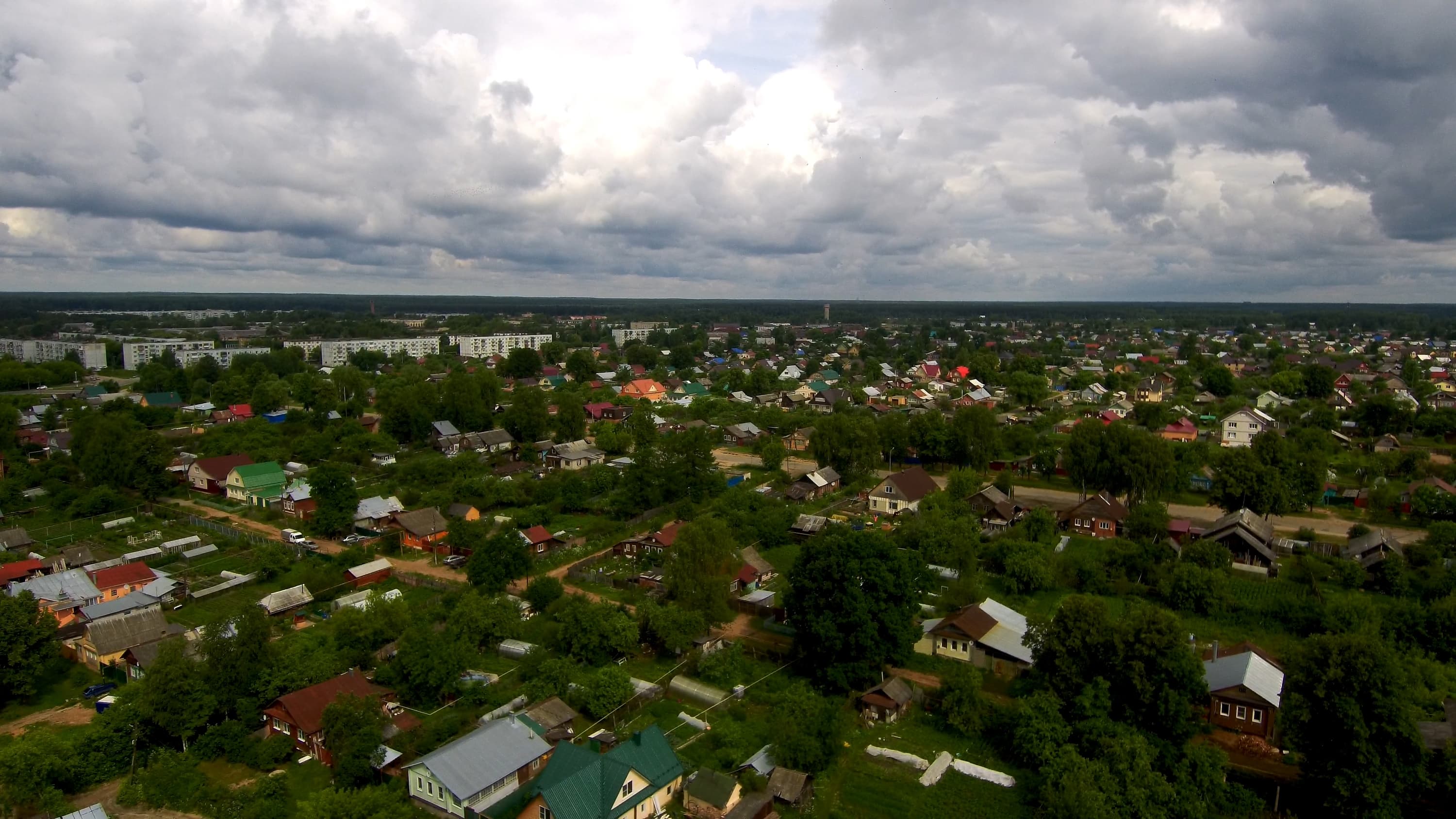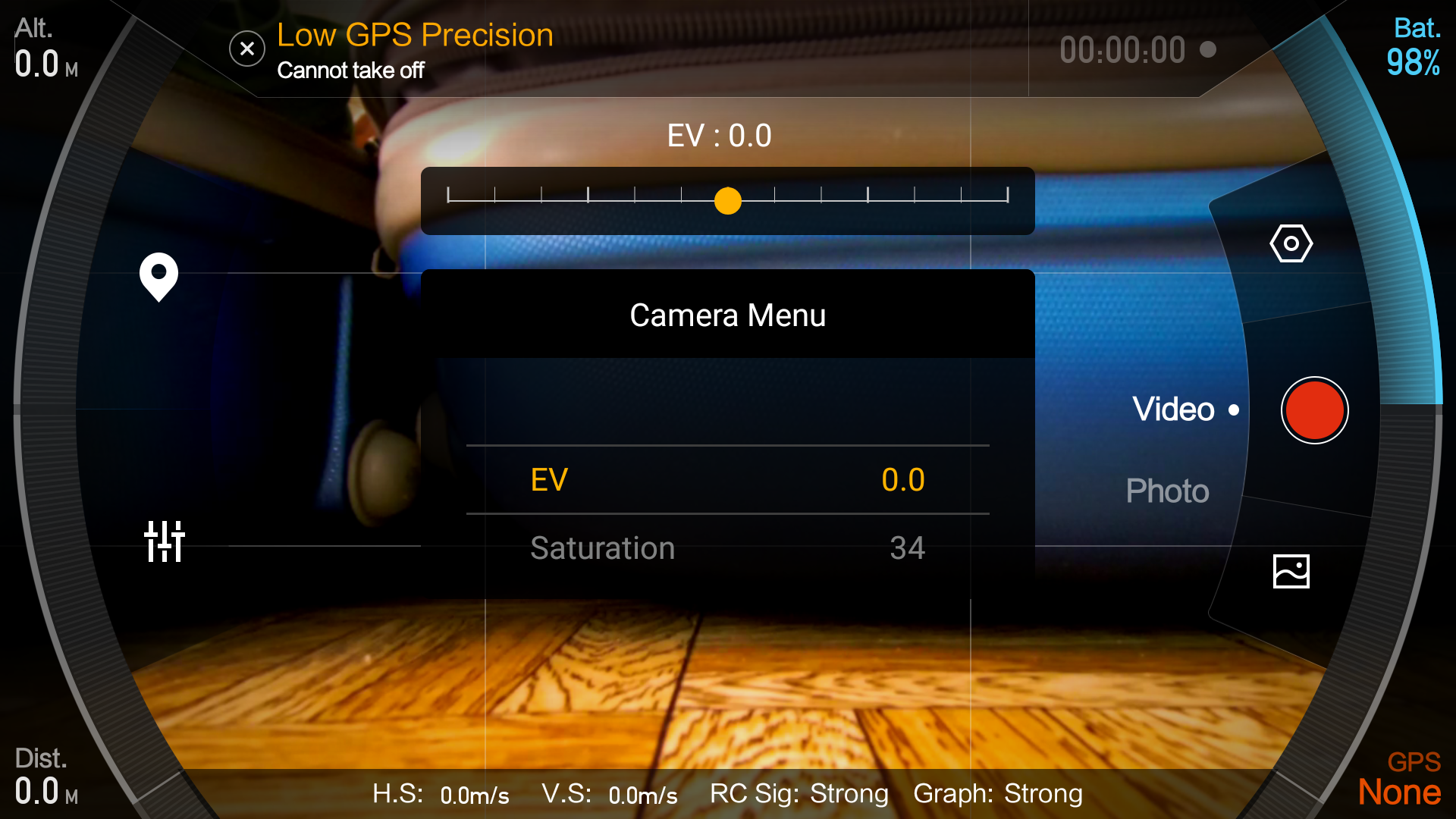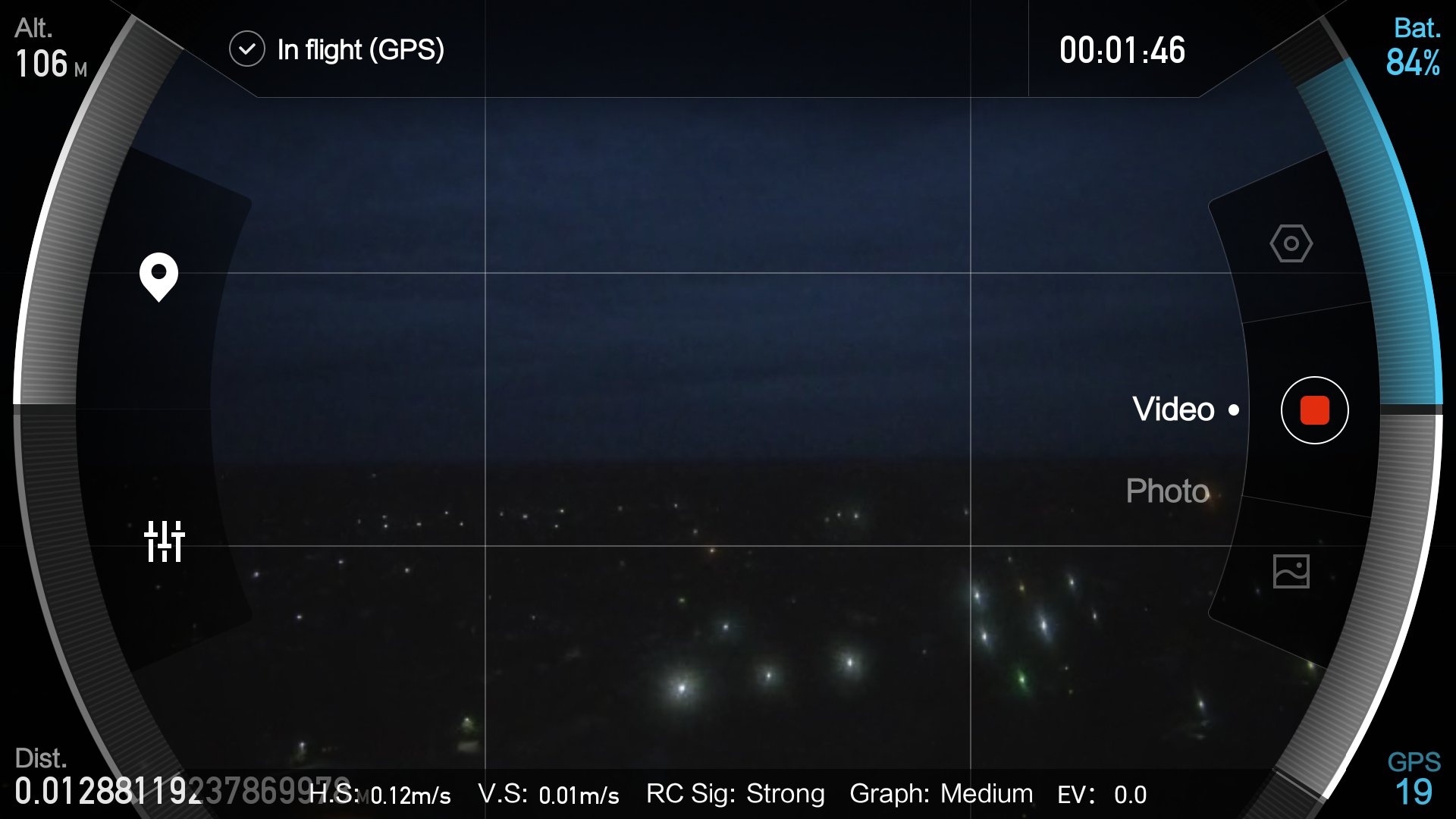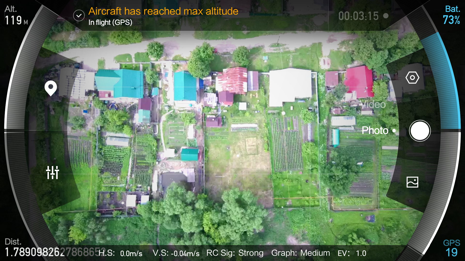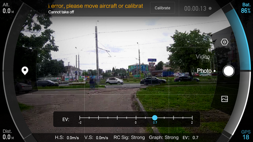 Итак, о пересвеченном небе. Да. Действительно, пересвечено. Проблема не в камере, а в операторе. Хотя, если уж по-справедливому, то в органах управления камерой. Регулировка экспозиции — кстати, единственный регулируемый параметр, относящийся к видеосъемке, если не считать выбора размера и частоты кадра — производится колесиком, которое находится на правом торце пульта управления. При его вращении на дисплее смартфона, который в это время подключен к пульту, высвечивается шкала EV с передвигающимся ползунком. Казалось бы, чего тут сложного — знай крути колесико до получения оптимальной яркости картинки.