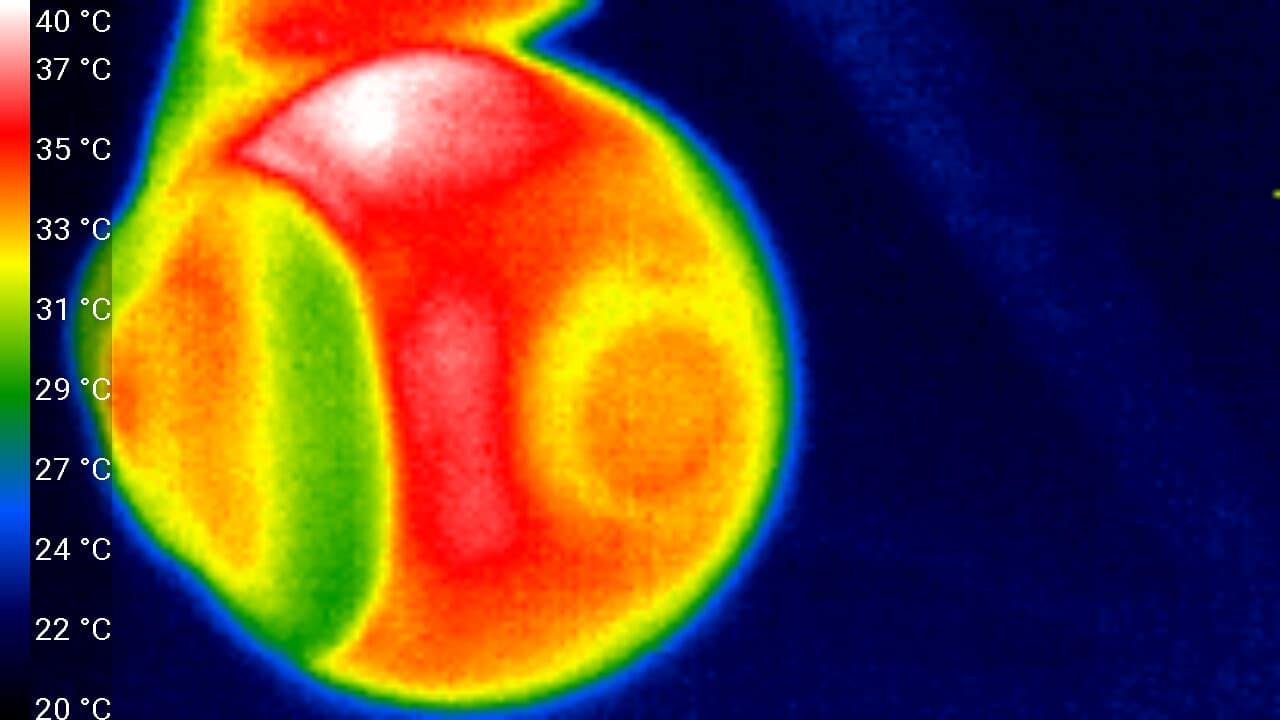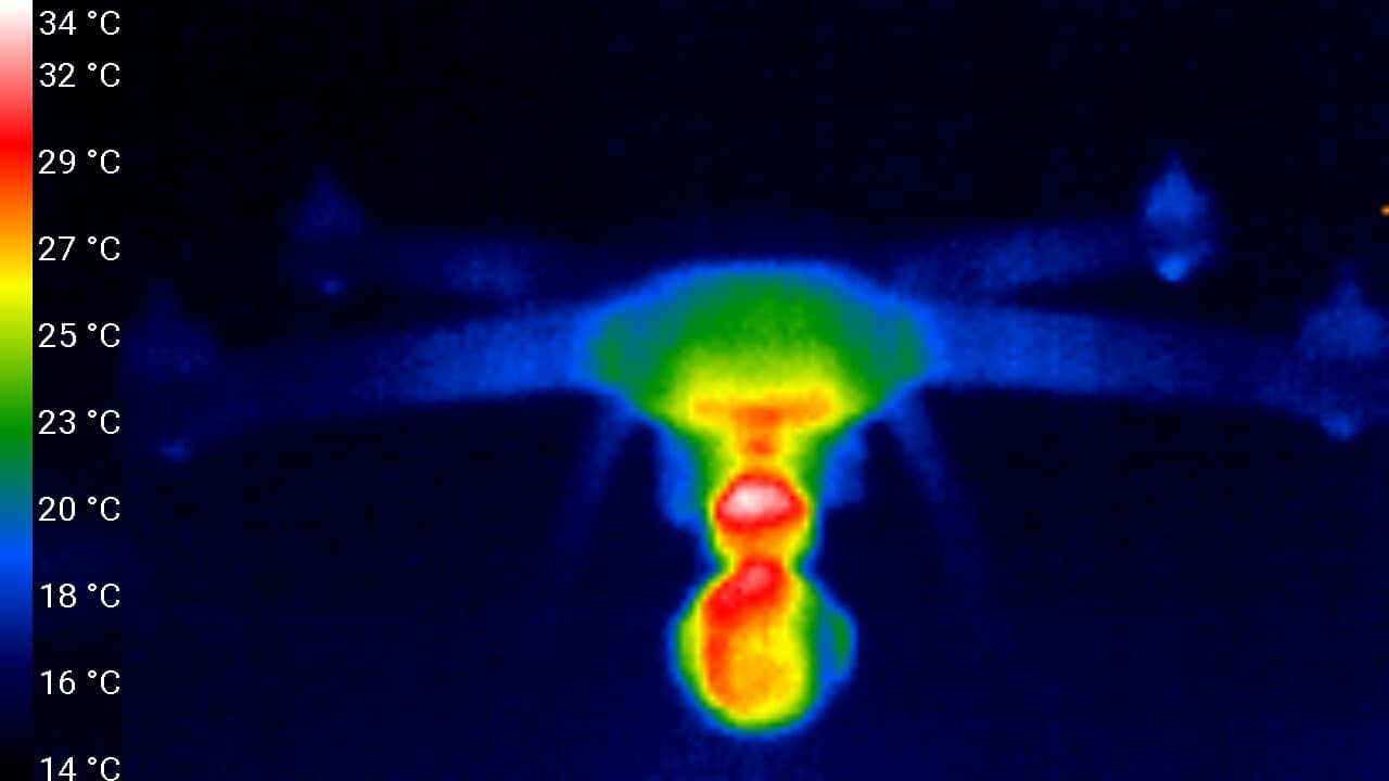 Тем не менее, положенные замеры нагрева камеры были произведены. Не в полете, конечно, а в стационарных условиях при комнатной температуре. Следующие теплоснимки получены после 15 минут беспрерывной видеозаписи в самом старшем режиме — 4K (3840×2160 30p). Можно видеть, что отдельные участки камеры — в верхней части шарообразного корпуса и в блоке стабилизирующих приводов — нагрелись до 40-41 °C. Так себе нагрев, не стоящий внимания и тем более тревог с учетом приведенных выше соображений.