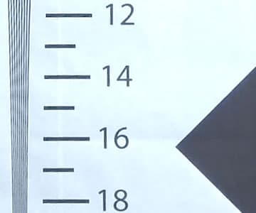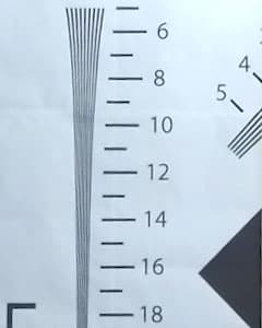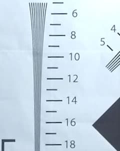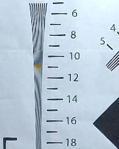 Измерение разрешающей способности камеры производилось при ярком искусственном освещении. Ввиду довольно большого угла обзора камеры нельзя произвести съемку тестовой таблицы целиком, для такой съемки таблица должна иметь слишком большие размеры. Ближе к объективу придвигать эту таблицу означает покинуть зону фокусировки (минимальное расстояние, на котором все объекты находятся в фокусе, составляет 30-40 см). Поэтому мы прибегли к другому проверенному способу — к съемке с разных расстояний одного участка таблицы, распечатанного на листе метровой высоты. Впоследствии полученное видео совмещается в видеоредакторе с оригинальным изображением тестовой таблицы до совпадения пропорций ключевых участков, при этом изменение размера кадра не происходит. В результате получается искомый ключевой участок, в котором кроется ответ на вопрос о разрешающей способности.