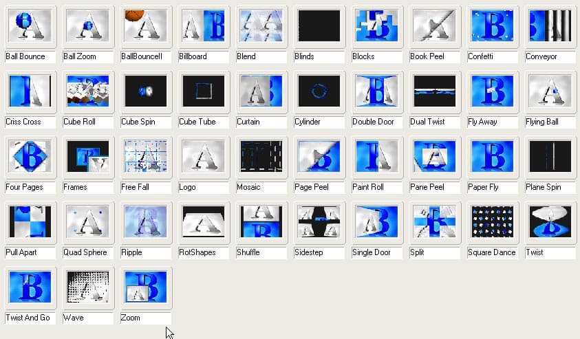 Это набор из простейших 3D переходов, содержащих огромное количество предустановленных эффектов, а с учетом того, что каждый из них еще и настраивается - просто неисчислимое множество.
