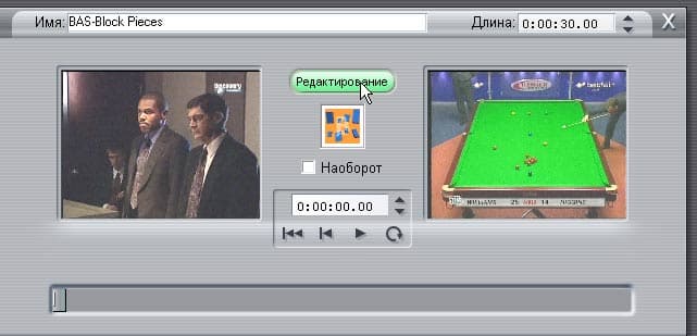 Hollywood FX, в отличие от Xplode, имеет собственную утилиту-оболочку, называющуюся Easy FX Editor. Вызвать ее можно как через кнопку Пуск, так и из программы-хоста. Для этого необходимо перетащить иконку выбранного перехода на тайм-линию, где уже расположены захваченные видеофрагменты, дважды щелкнуть по переходу и нажать кнопку Edit в появившемся окне редактирования.