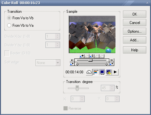 По нажатии кнопки Options появится окно расширенной настройки перехода. Здесь доступно практически всё: от выбора типа 3D объекта и наложения теней, до смены текстур объекта и способа их движения. Разумеется, сам переход здесь можно увидеть в движении без предварительного просчета (рендеринга). Также существует возможность импорта в программу своих 3D моделей. Xplode работает с файлами в формате *.Х3D, поэтому модели, скорее всего, придется конвертировать при помощи специальной утилиты Canopus 3DS Compiler.