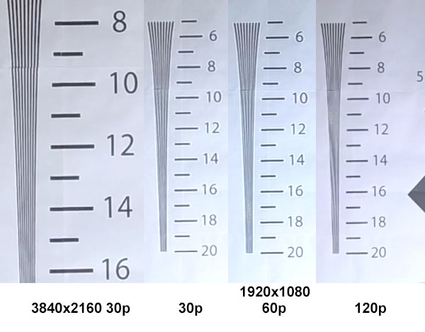 Результат — очень неплохо! 1400 хорошо читаемых ТВ-линий в 4K. Разумеется, в Full HD-режиме разрешающая способность оказывается существенно ниже, чем в «просто Full HD»-камерах, достигая 800 ТВ-линий.