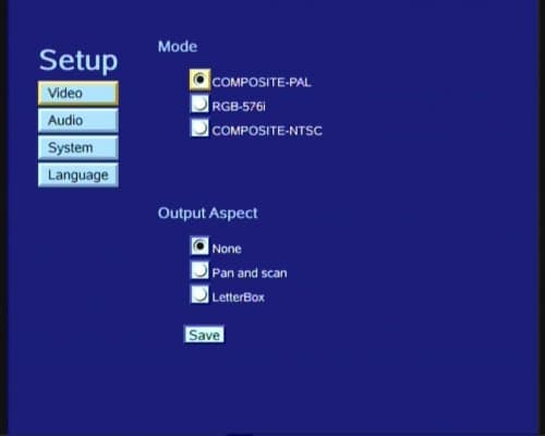 Опишем настройки самого ресивера. Базовое меню позволяет выбрать тип отображения видео (композит PAL, композит NTSC или RGB), формат экрана, режим работы цифрового аудиовыхода, установить временную зону для встроенных часов, выбрать язык (в тестируемой прошивке был только английский).
