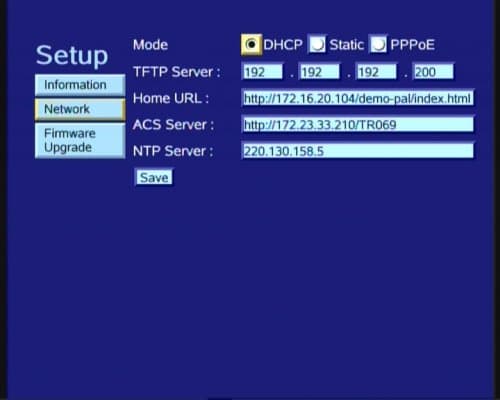 Дополнительные настройки, которые касаются работы ресивера в сети IPTV, закрыты паролем. На первом экране отображается информация о STB – название модели, версии аппаратной части и прошивки, сетевые адреса. Второй экран можно использовать для настройки сетевых параметров. Для получения IP-адреса можно использовать DHCP, ручную настройку или PPPoE. Здесь же задаются основные адреса серверов – TFTP для обновления прошивки (которое, кстати, также может быть выполнено по multicast – это еще одно сходство со спутниковыми ресиверами), URL стартовой страницы, адрес сервера ACS для автоматической настройки ресивера (используется провайдерами для массовой настройки на свою сеть) и NTP для синхронизации часов. Последний пункт дополнительного меню – обновления прошивки через указанный ранее сервер.