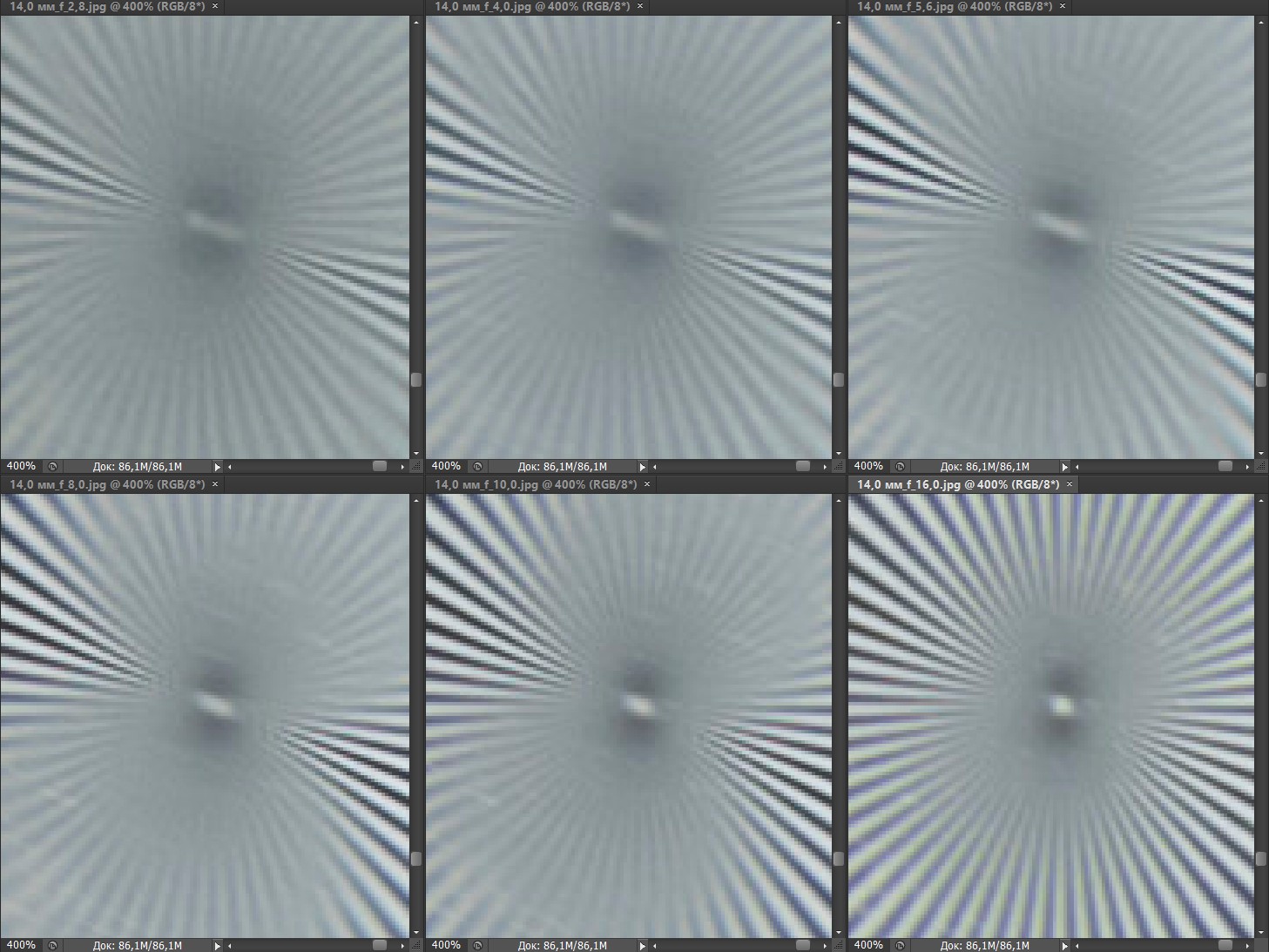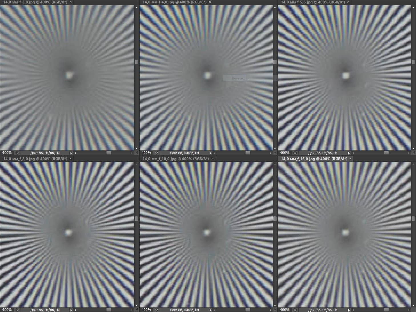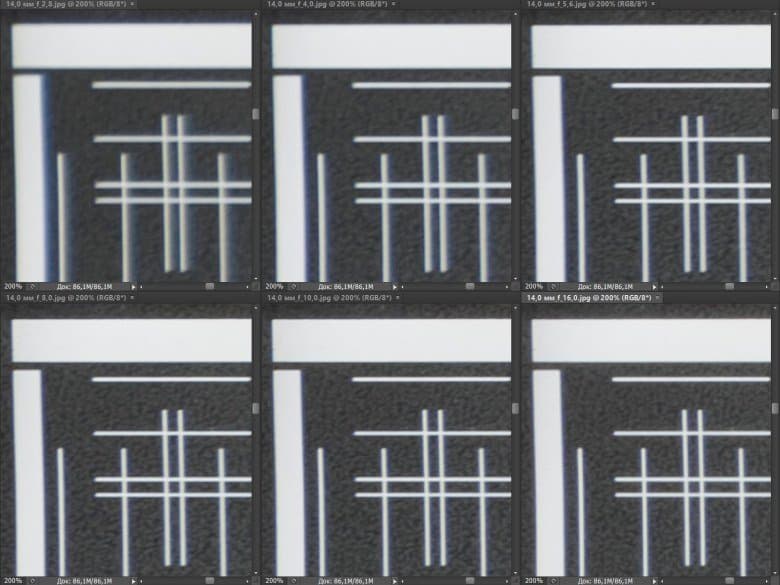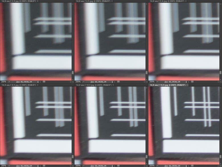 Диафрагмирование до F4—F5,6 позволяет повысить резкость с постепенным охватом все большей площади кадра по мере уменьшения относительного отверстия, однако резкость по-прежнему остается неприемлемой. Это наблюдение подтверждает наш тезис о том, что побывавший у нас на испытаниях экземпляр Canon EF 14mm f/2.8L II USM имеет скрытый дефект.