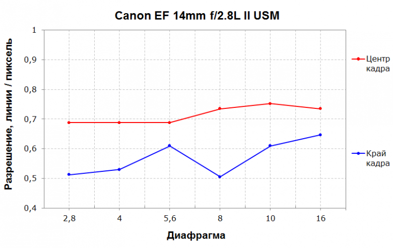 Зависимость разрешающей способности от диафрагмы в центре кадра стабильная: на открытых диафрагмах держится на уровне 70% и немного возрастает при закрытии от f/8. Для широкоугольного объектива это неплохой результат. А вот край кадра портит общую картину: здесь разрешение «гуляет» и в целом находится на невысоком уровне. Углы у широкоугольных объективов никогда не были сильным местом, но здесь возникает ощущение, что у данного экземпляра какие-то технические неполадки.