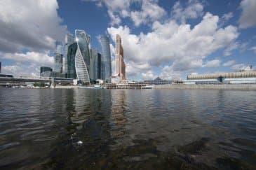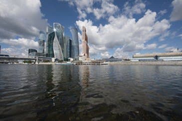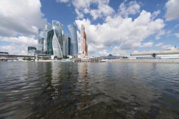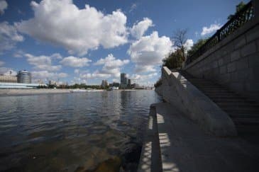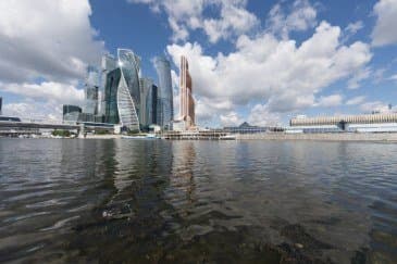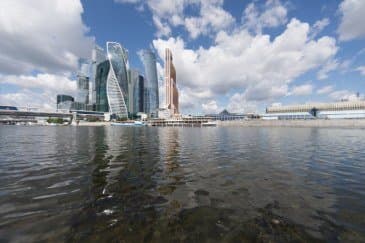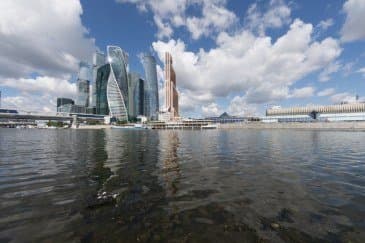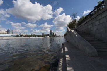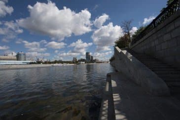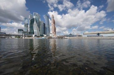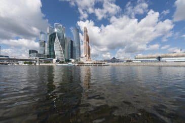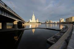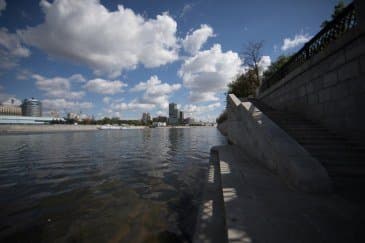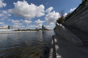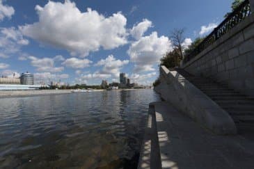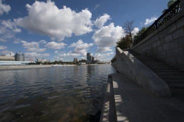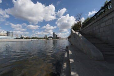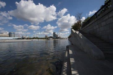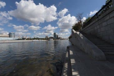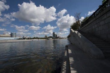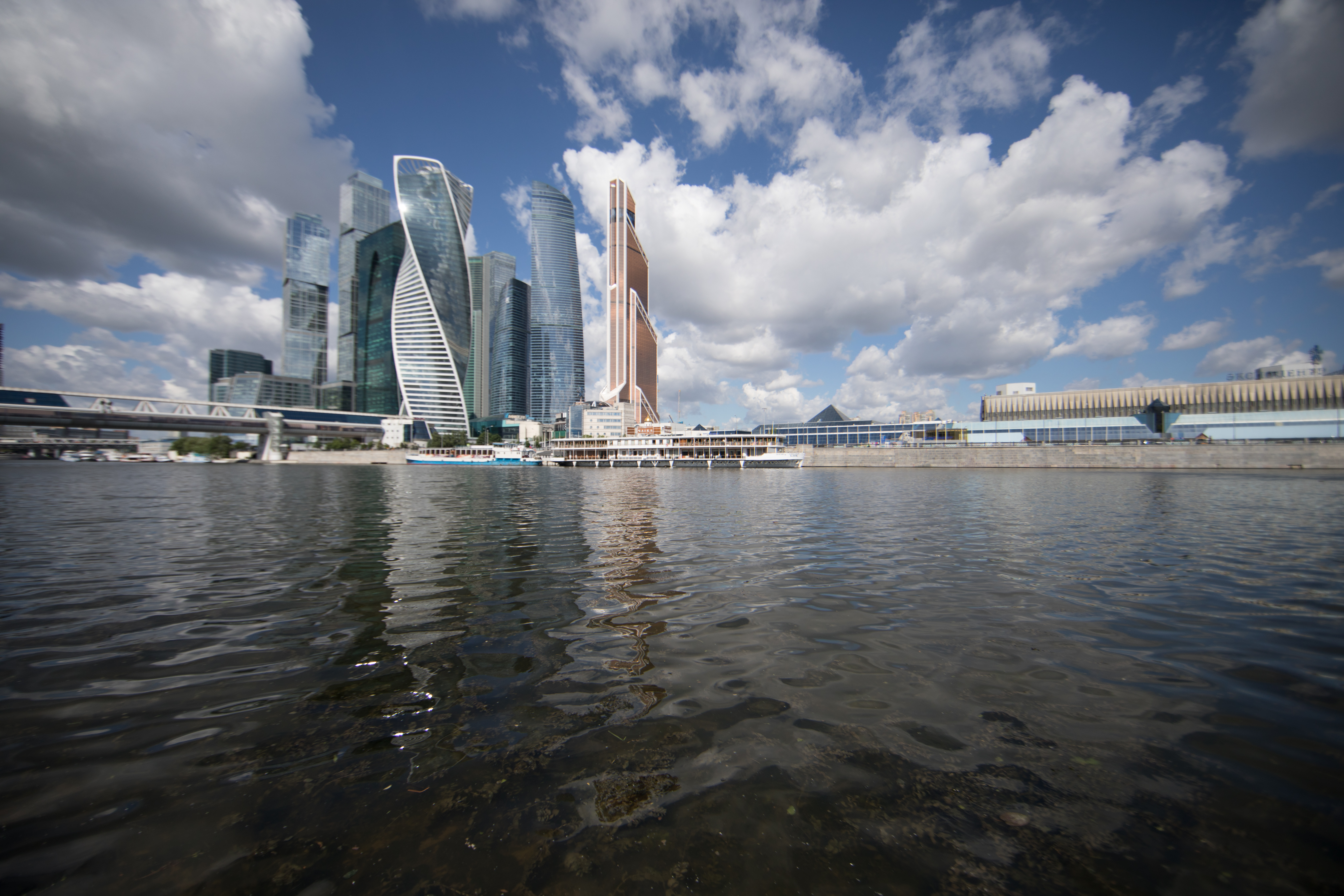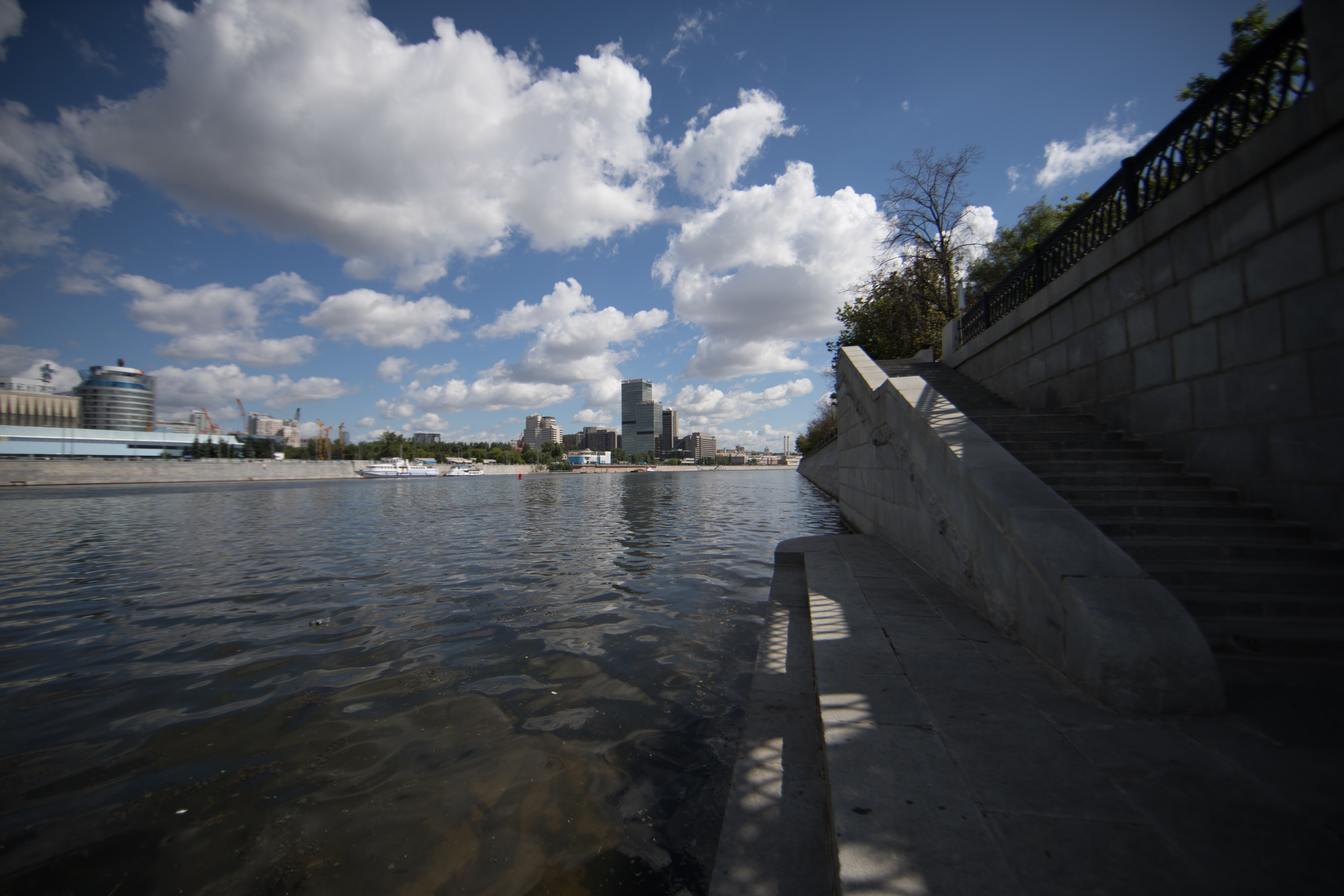 Проведем подробное исследование этих и других «черт характера» Canon EF 14mm f/2.8L II USM в более приличных условиях. Итак, яркий день, но солнце вне кадра; созданы все предпосылки для того, чтобы оптика проявила себя по максимуму возможностей. Это наша излюбленная сцена — Москва-Сити и Краснопресненская набережка Москвы-реки, снятые с противоположного берега, то есть с набережной Тараса Шевченко, от самой воды, при ISO 100. Приведем по паре картинок для каждого значения диафрагмы: слева — результат проявки в Adobe Camera RAW без приложения профиля объектива, справа — с коррекцией при приложении профиля.