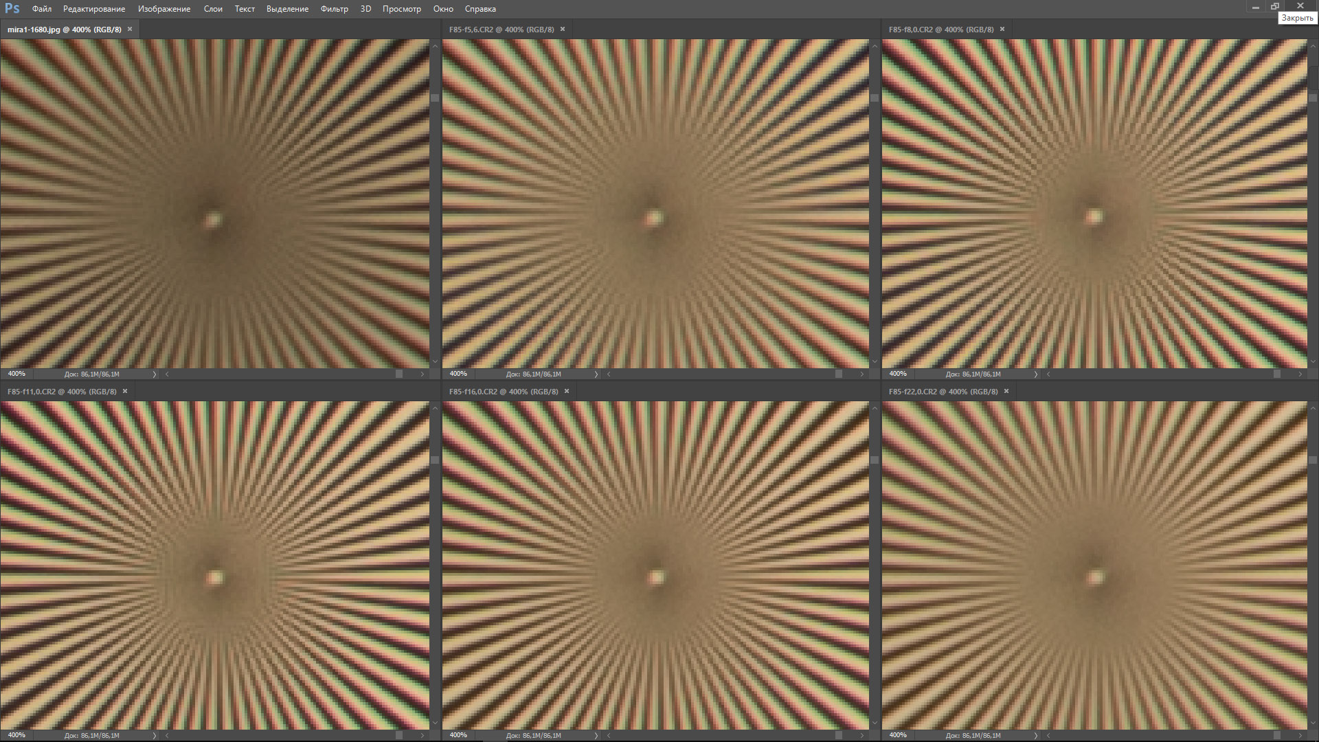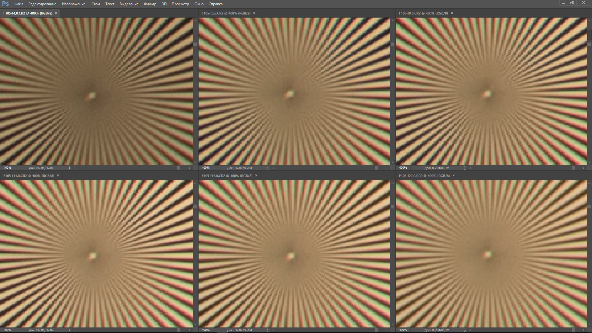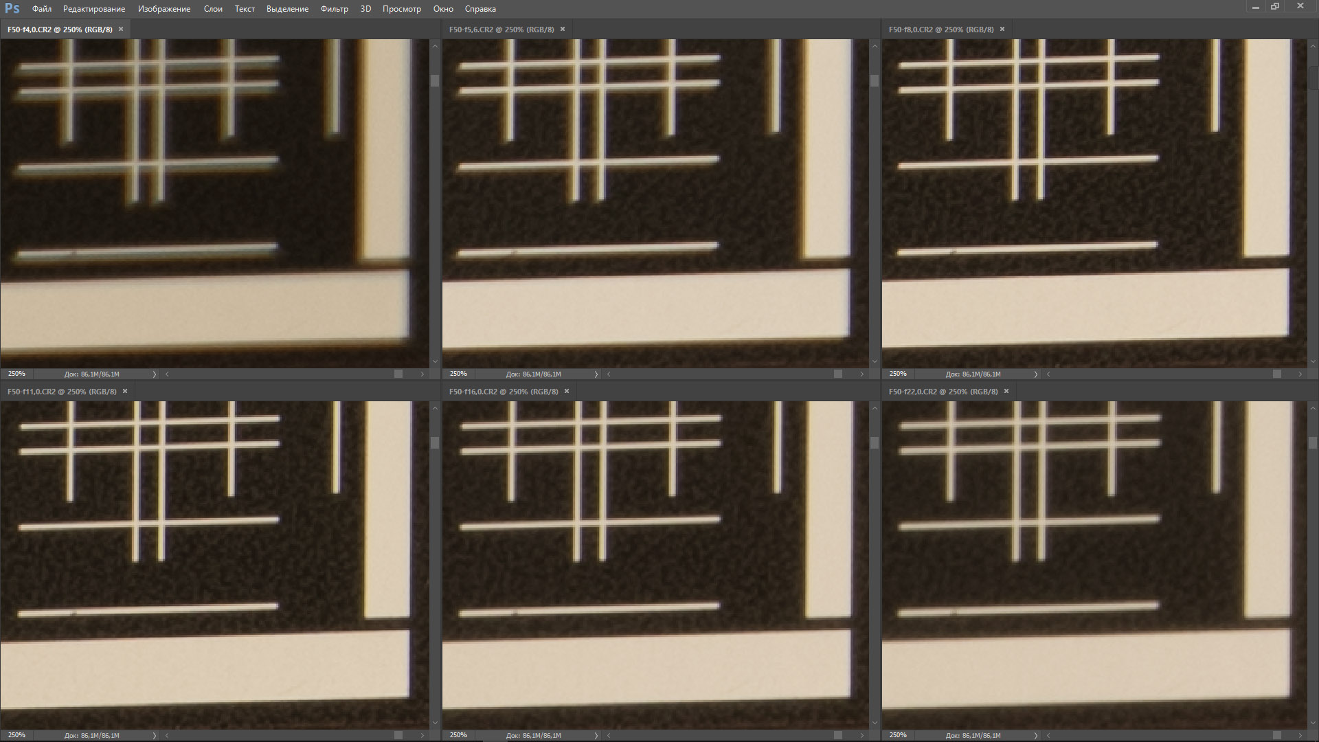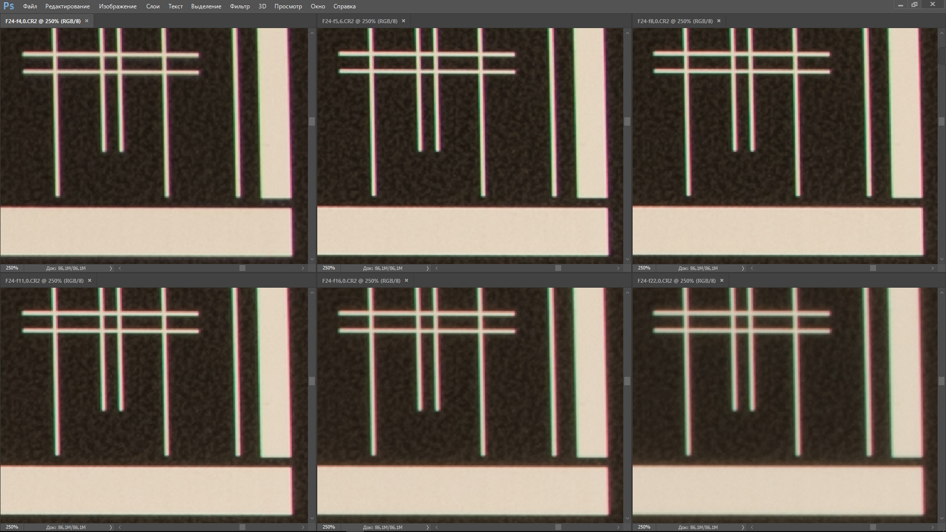 | На всех скриншотах верхний ряд: f/4,0 — f/5,6 — f/8,0; нижний ряд: f/11 — f/16 — f/22 | |||