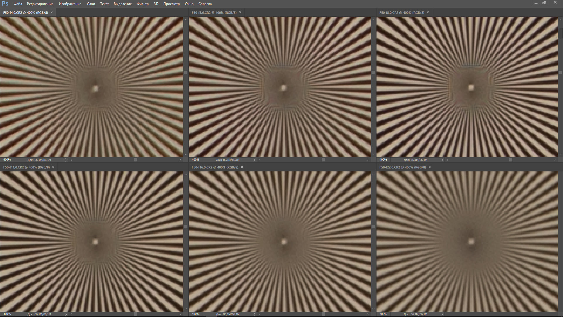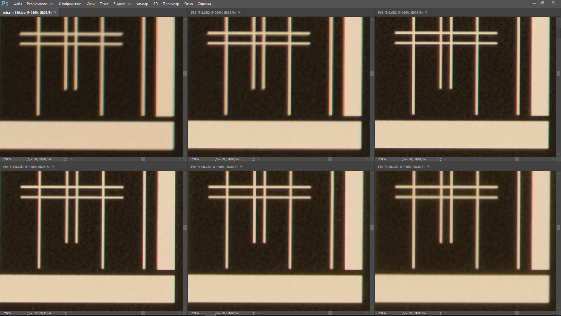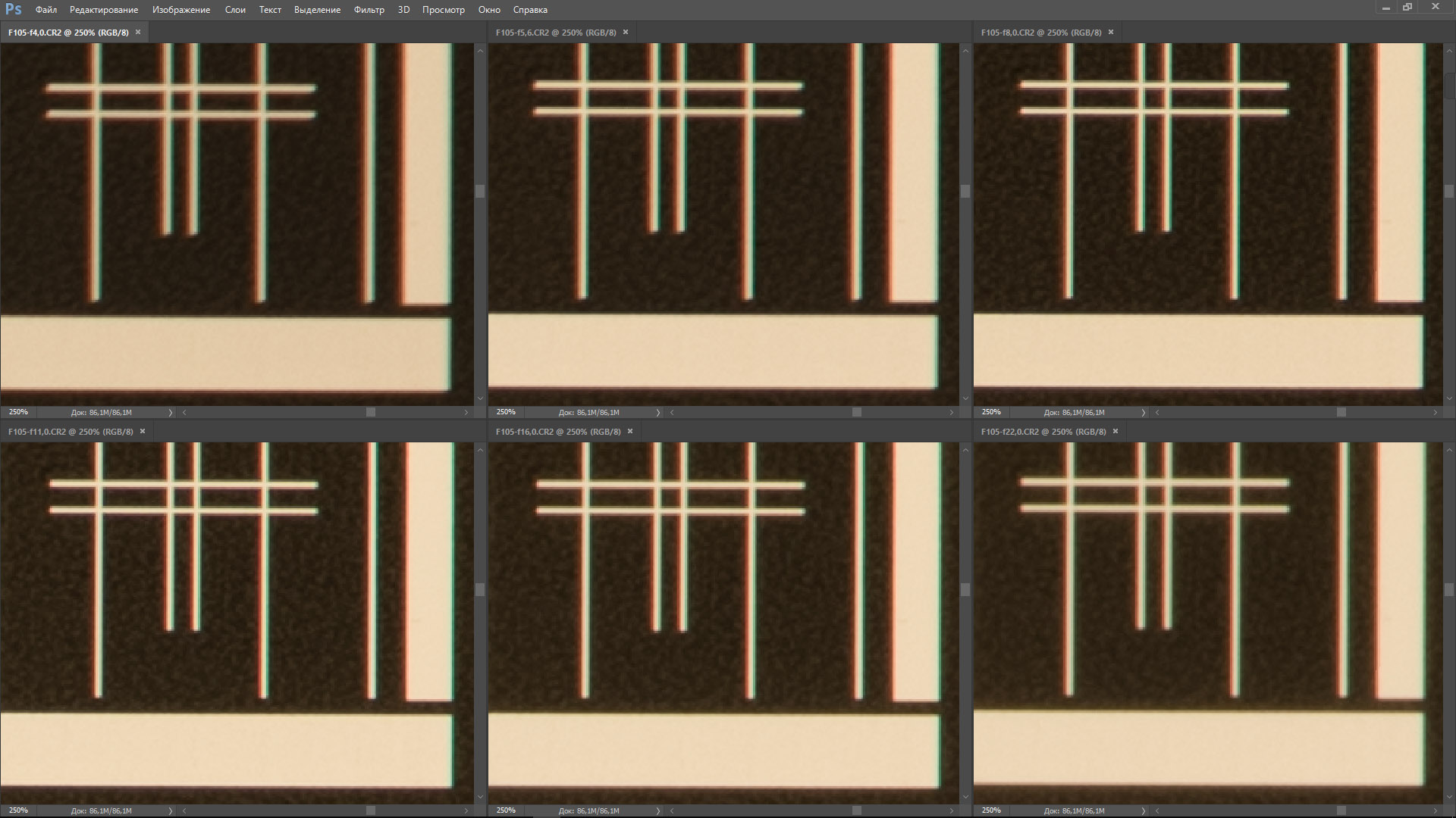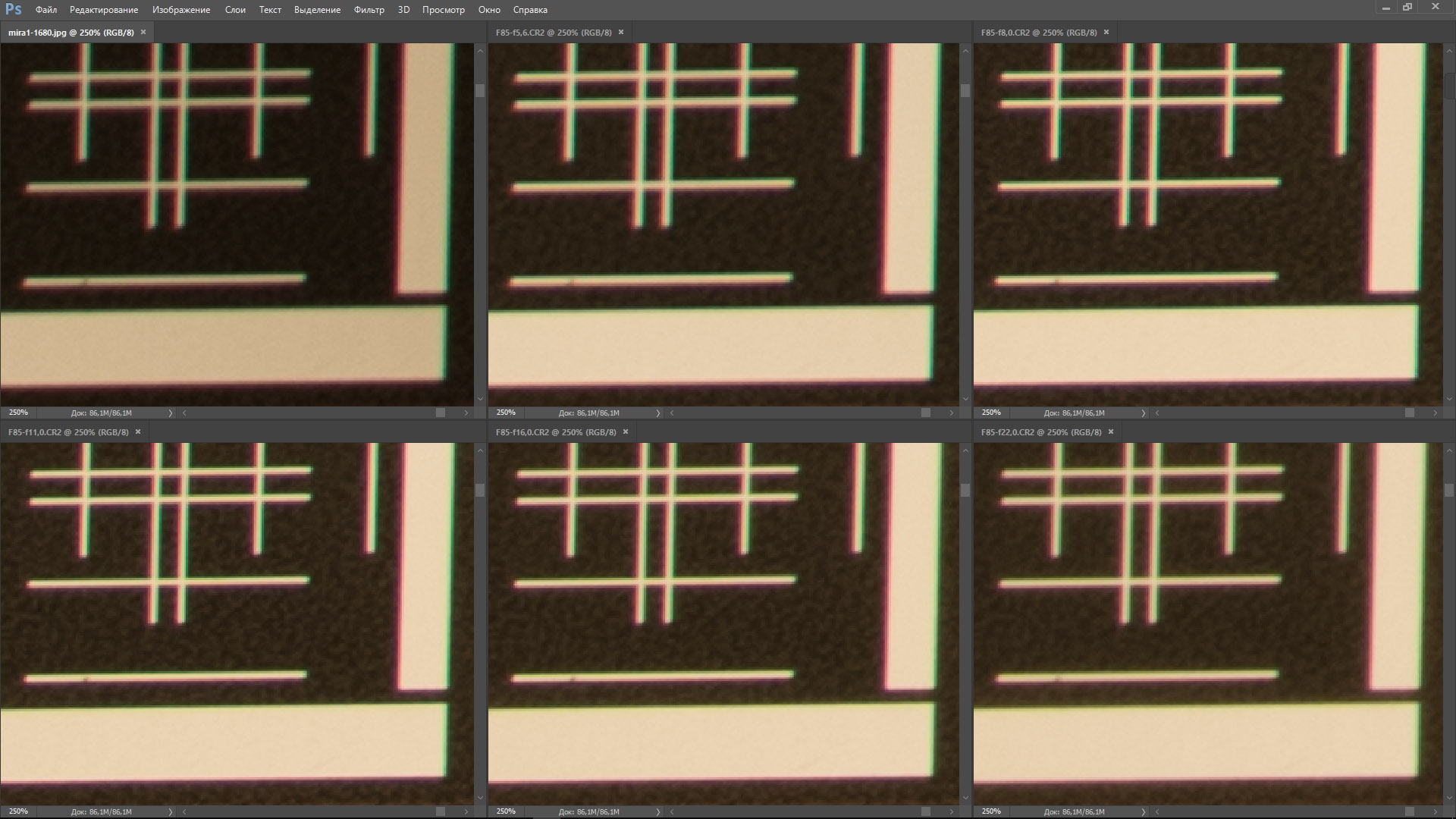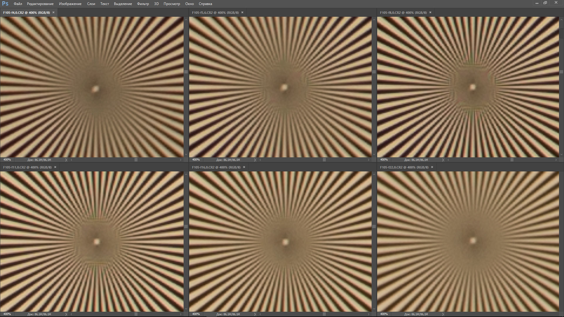 | На всех скриншотах верхний ряд: f/4,0 — f/5,6 — f/8,0; нижний ряд: f/11 — f/16 — f/22 | |||