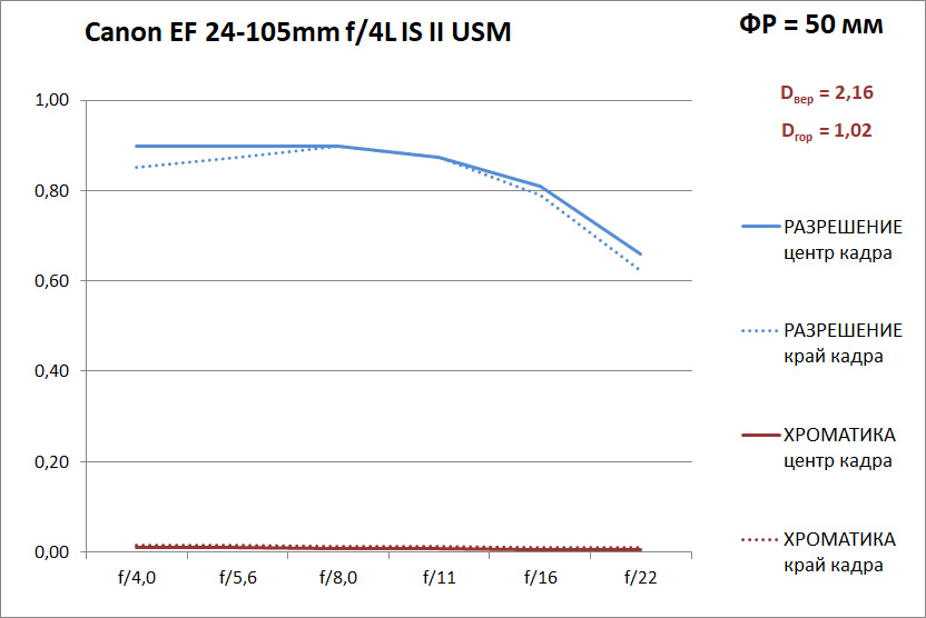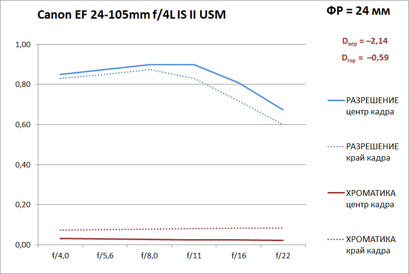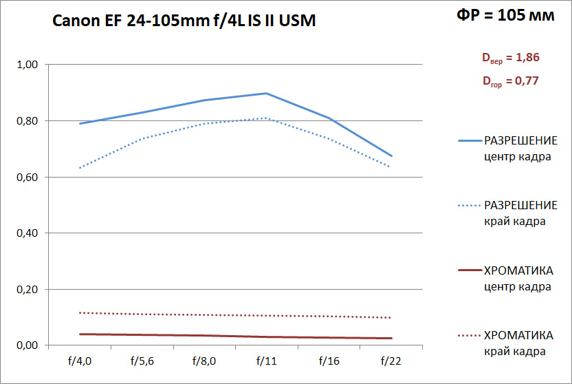 На краю кадра широкая диафрагма дает еще меньшее разрешение — чуть выше 0,6 линии. Здесь владельцу Canon EF 24-105mm f/4L IS II USM придется держать в уме, что на широкой диафрагме и фокусном расстоянии 85 мм картинка будет мягкая, а «звенящую» резкость будет получить сложно.
