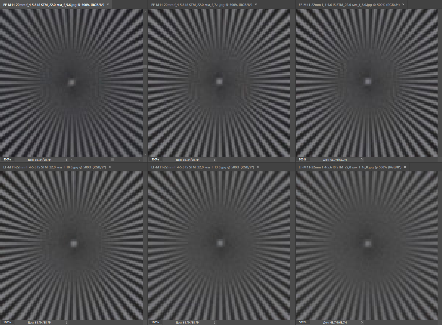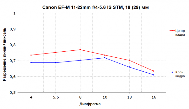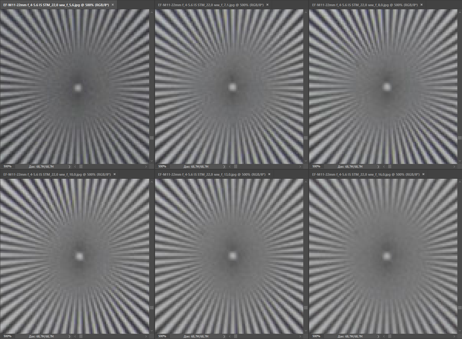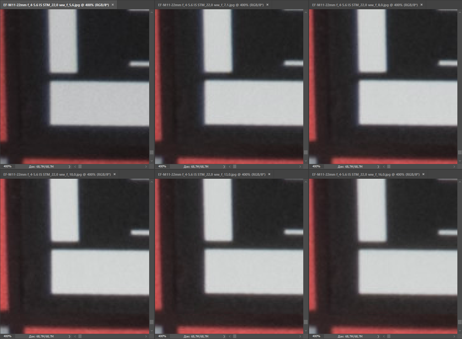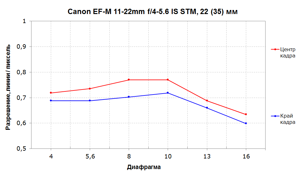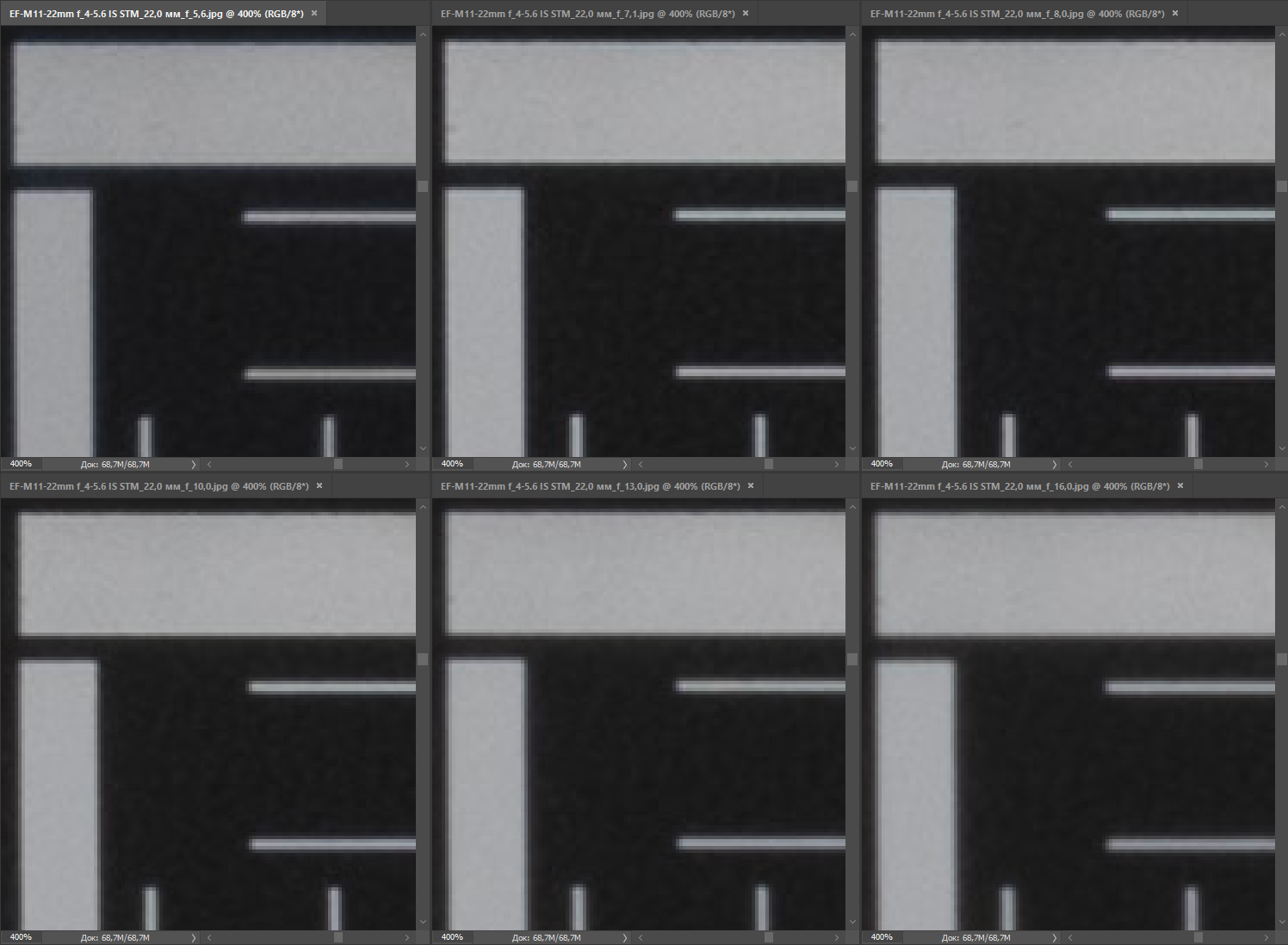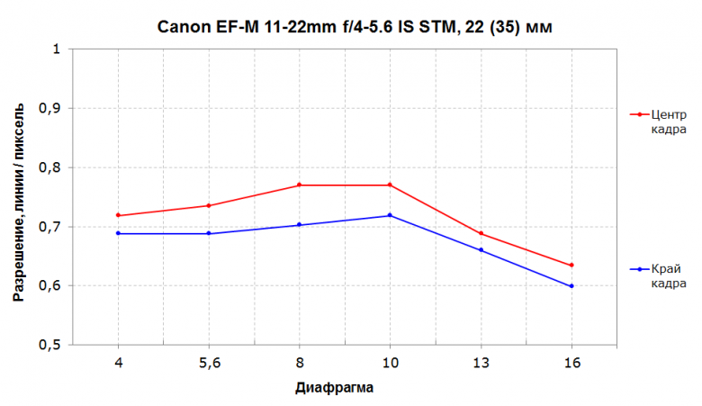 На 22 мм ситуация повторяется практически один в один: стабильно нормальное качество изображения в начале ряда диафрагменных чисел с плавным снижением резкости во второй половине.