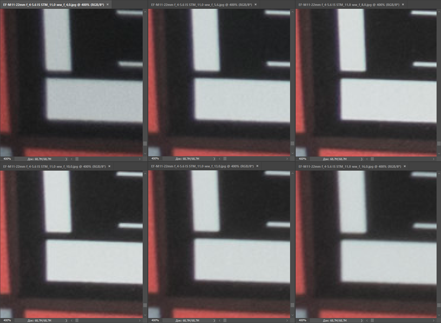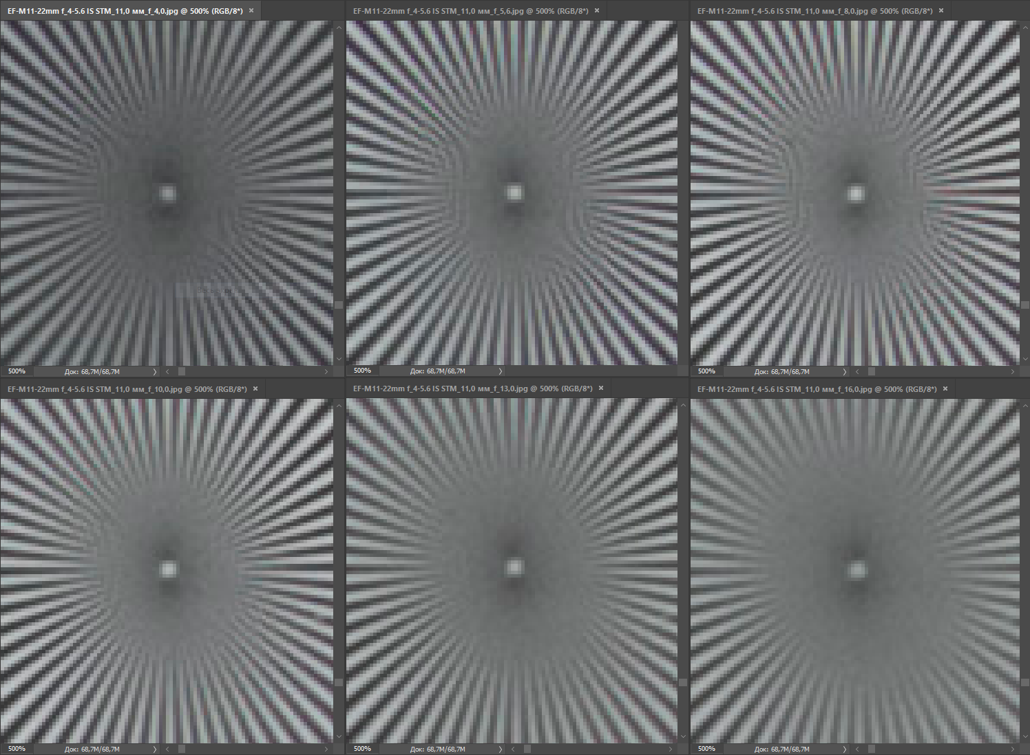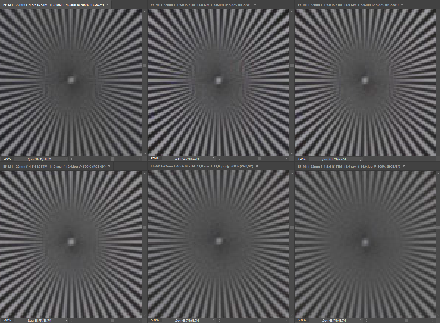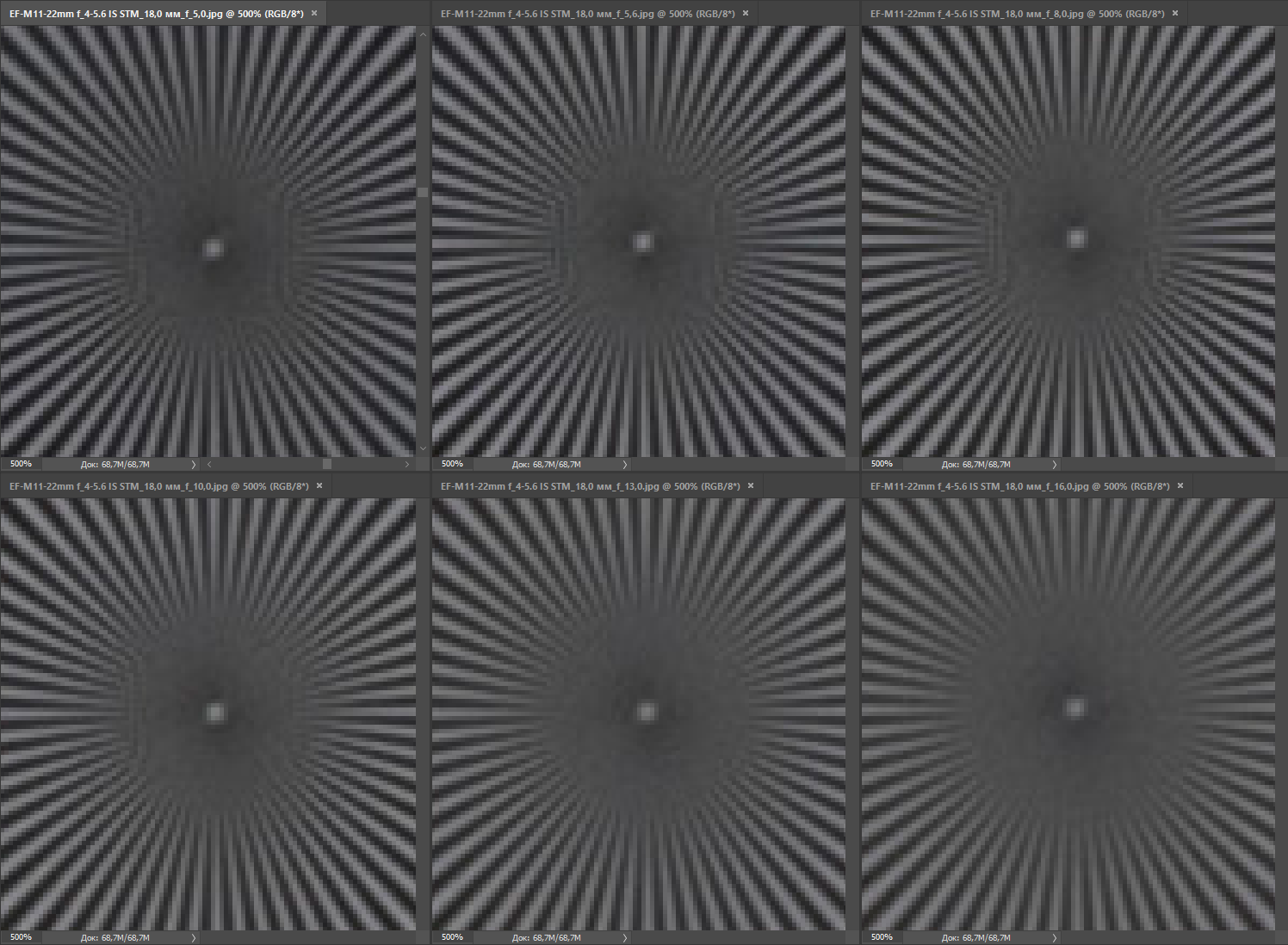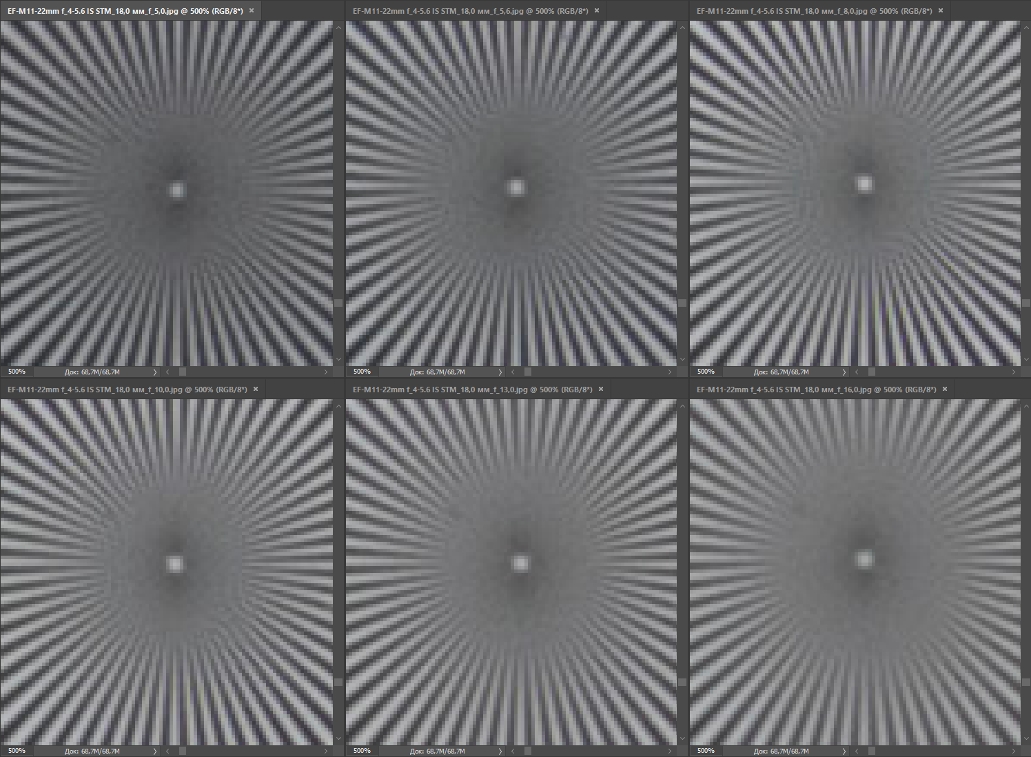 На 22 мм ситуация повторяется практически один в один: стабильно нормальное качество изображения в начале ряда диафрагменных чисел с плавным снижением резкости во второй половине.