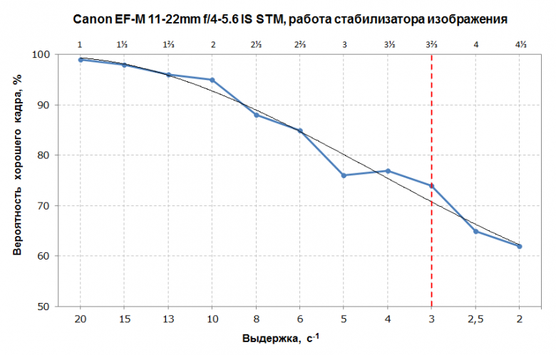 Наша редакционная методика тестирования систем стабилизации в большей степени ориентирована на средние и большие фокусные расстояния и нередко в случае с широкоугольными объективами показывает результаты даже превосходящие паспортные значения, заявленные производителем. По этой причине не будем спешить с выводами и просто отметим, что в лаборатории объектив показал 3⅔ ступени компенсации.