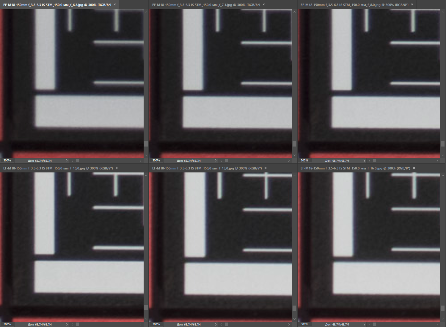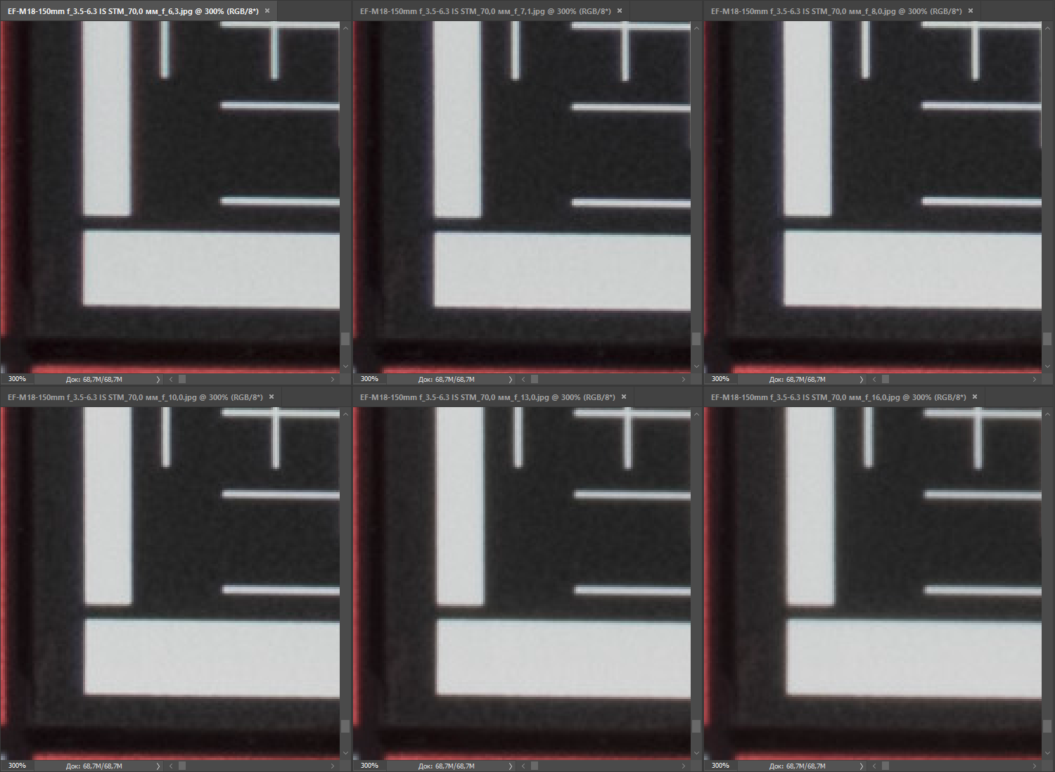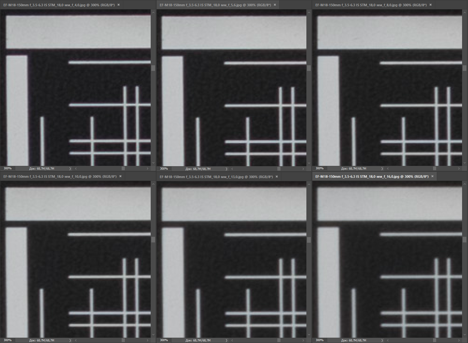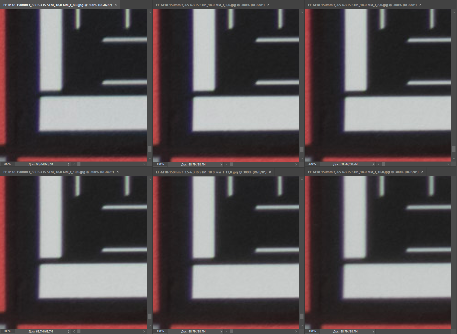 | на всех скриншотах верхний ряд: f/4 — f/5,6 — f/8, нижний ряд: f/10 — f/13 — f/16 | |