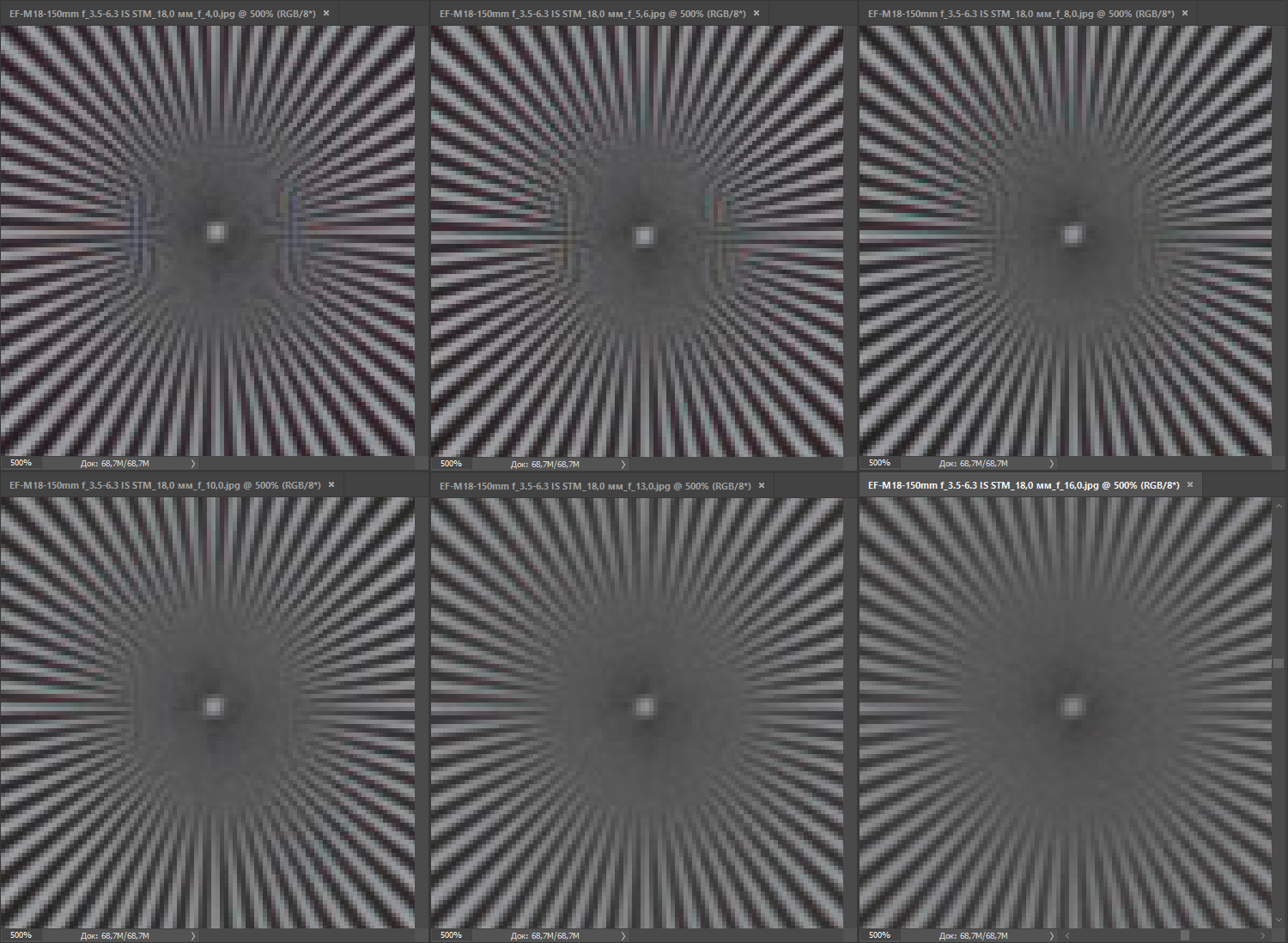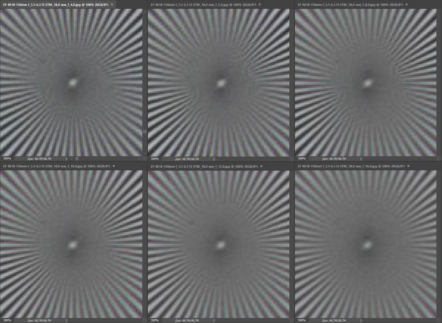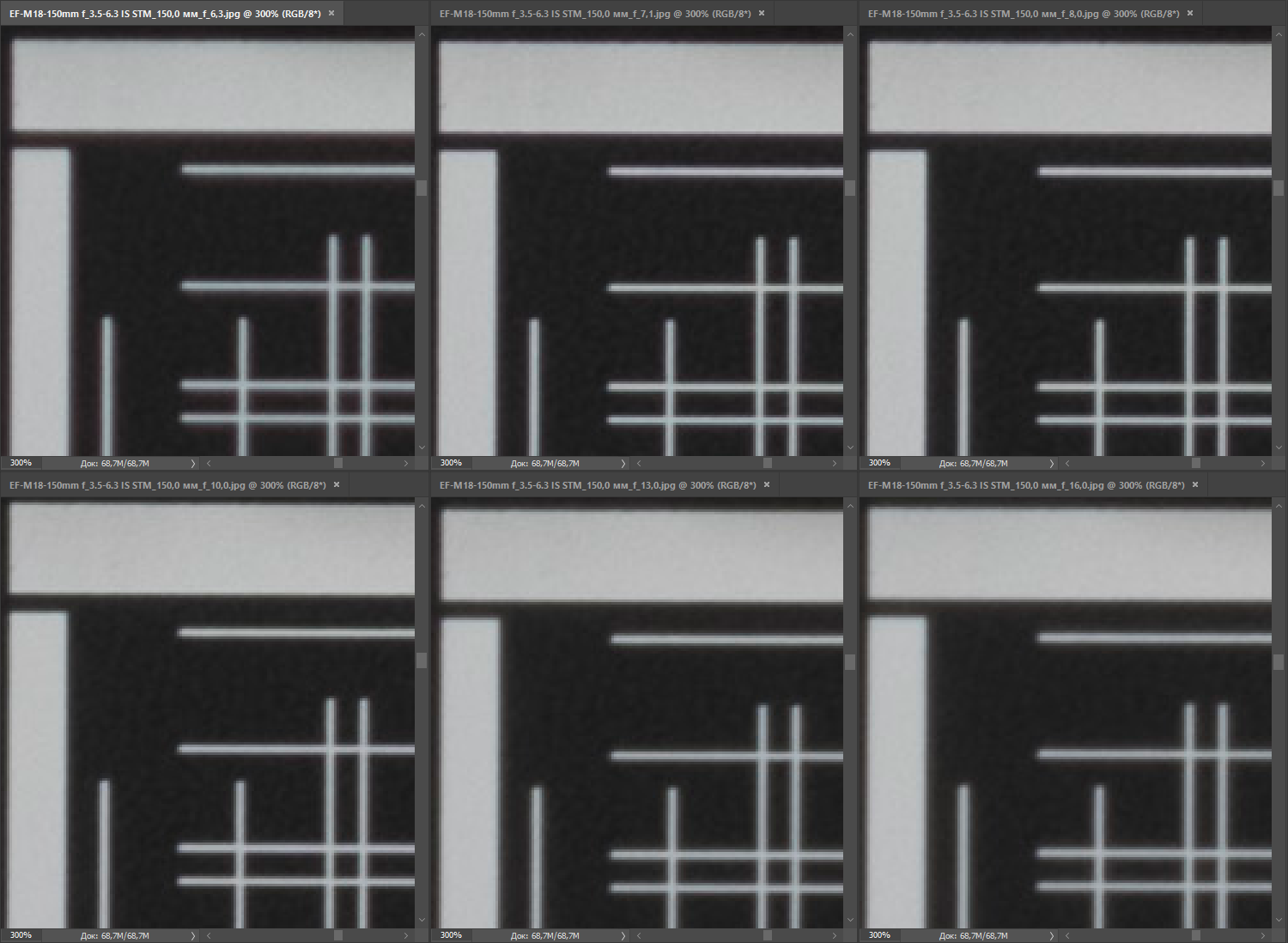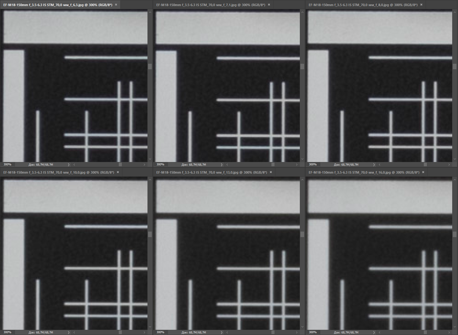 | на всех скриншотах верхний ряд: f/4 — f/5,6 — f/8, нижний ряд: f/10 — f/13 — f/16 | |