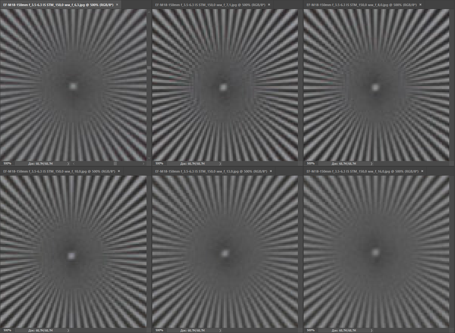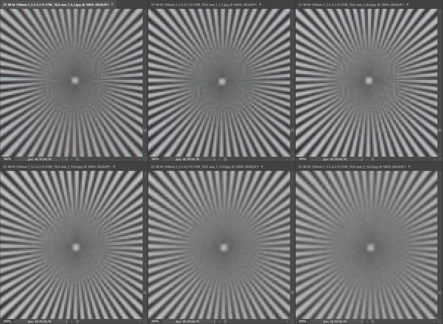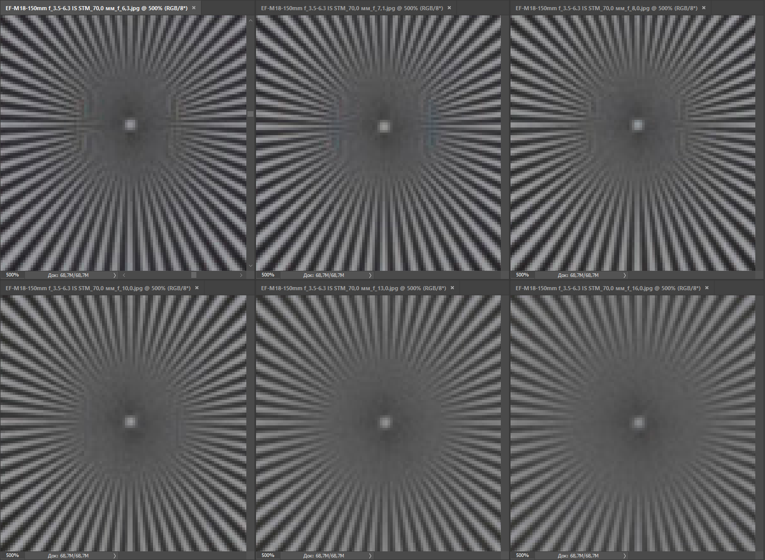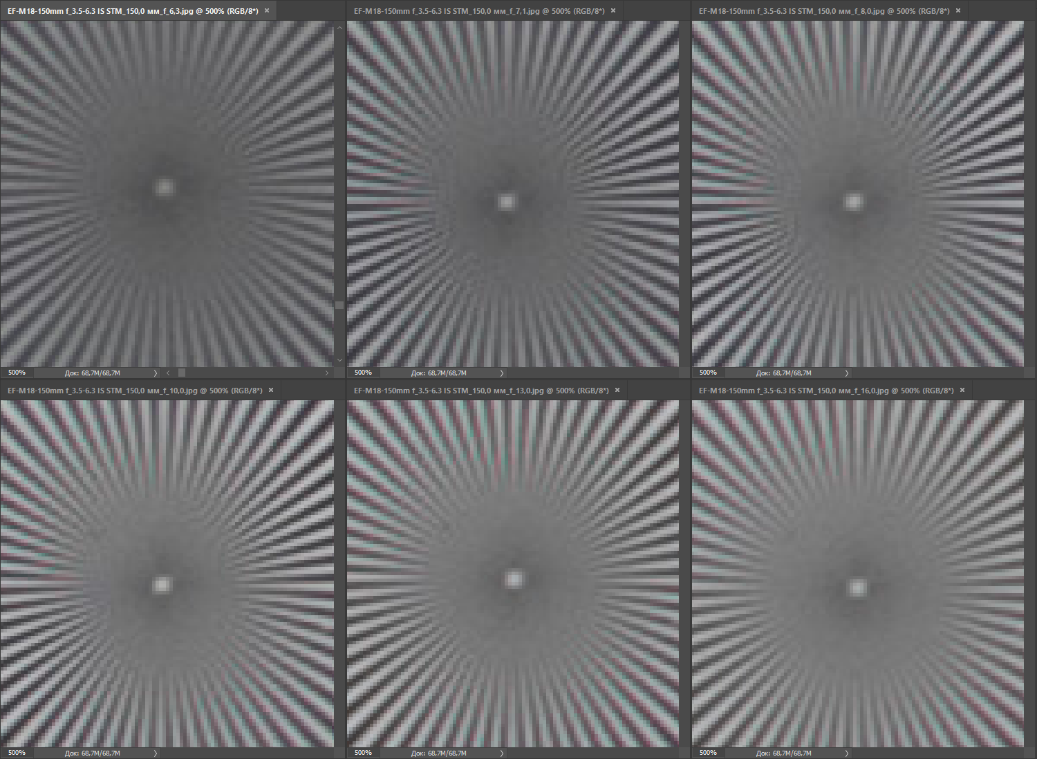 | на всех скриншотах верхний ряд: f/4 — f/5,6 — f/8, нижний ряд: f/10 — f/13 — f/16 | |