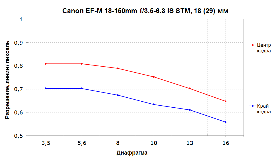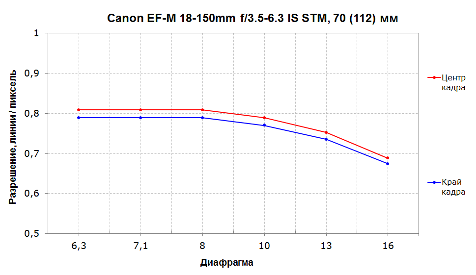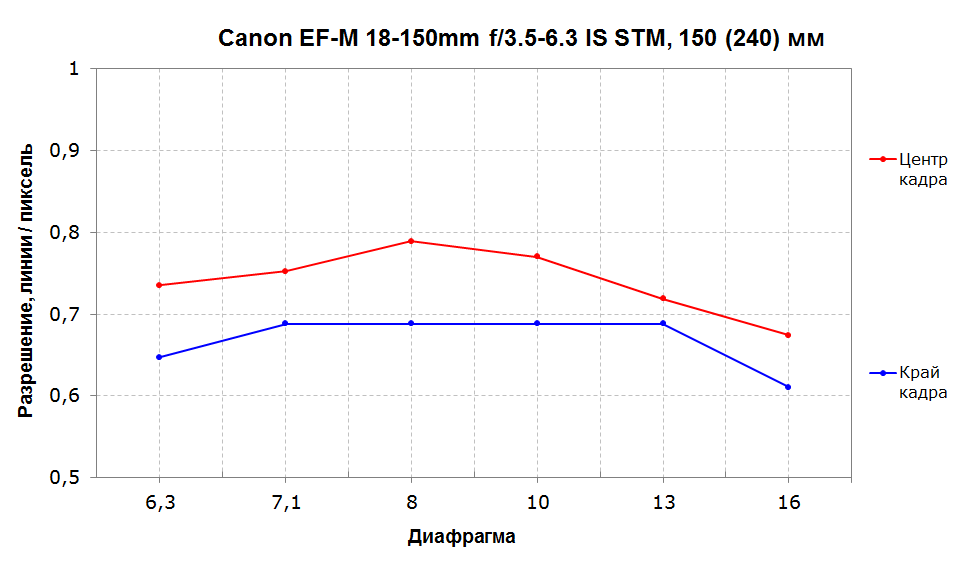 На максимальных 150 мм разрешение в центре кадра на открытой диафрагме становится незначительно ниже, но приближается к 80% на диафрагме f/8. Край кадра снова демонстрирует ощутимое отставание от центра. Хроматические искажения крайне незначительны.