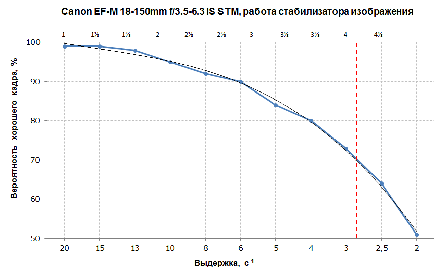 Протестированный на нашем стенде объектив показал замечательные стабилизирующие характеристики. Даже на 4 ступенях компенсации объектив выдает более 70% четких кадров!